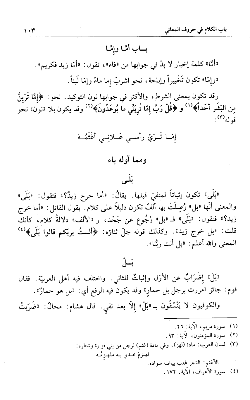 "بَلَى" تكون إثباتاً لمنفيّ قبلها. يقال: "أما خرج زيدٌ?" فنقول: "بَلَى" والمعنى أنّها "بل" وُصِلَتْ بِهَا ألفٌ تكون دليلاً عَلَى كلام. يقول القائل: "أما خرج زيد?" فتقول: "بَلَى" فـ"بل" رُجُوع عن جَحْد، و"الألف" دلالةُ كلام، كَأَنَّك قلت: "بل خرج زيد". وكذلك قوله جلّ ثناؤه: {أَلَسْتُ بِرَبِّكُمْ قَالُوا بَلَى} 4 المعنى والله أعلم: "بل أنت ربُّنا".