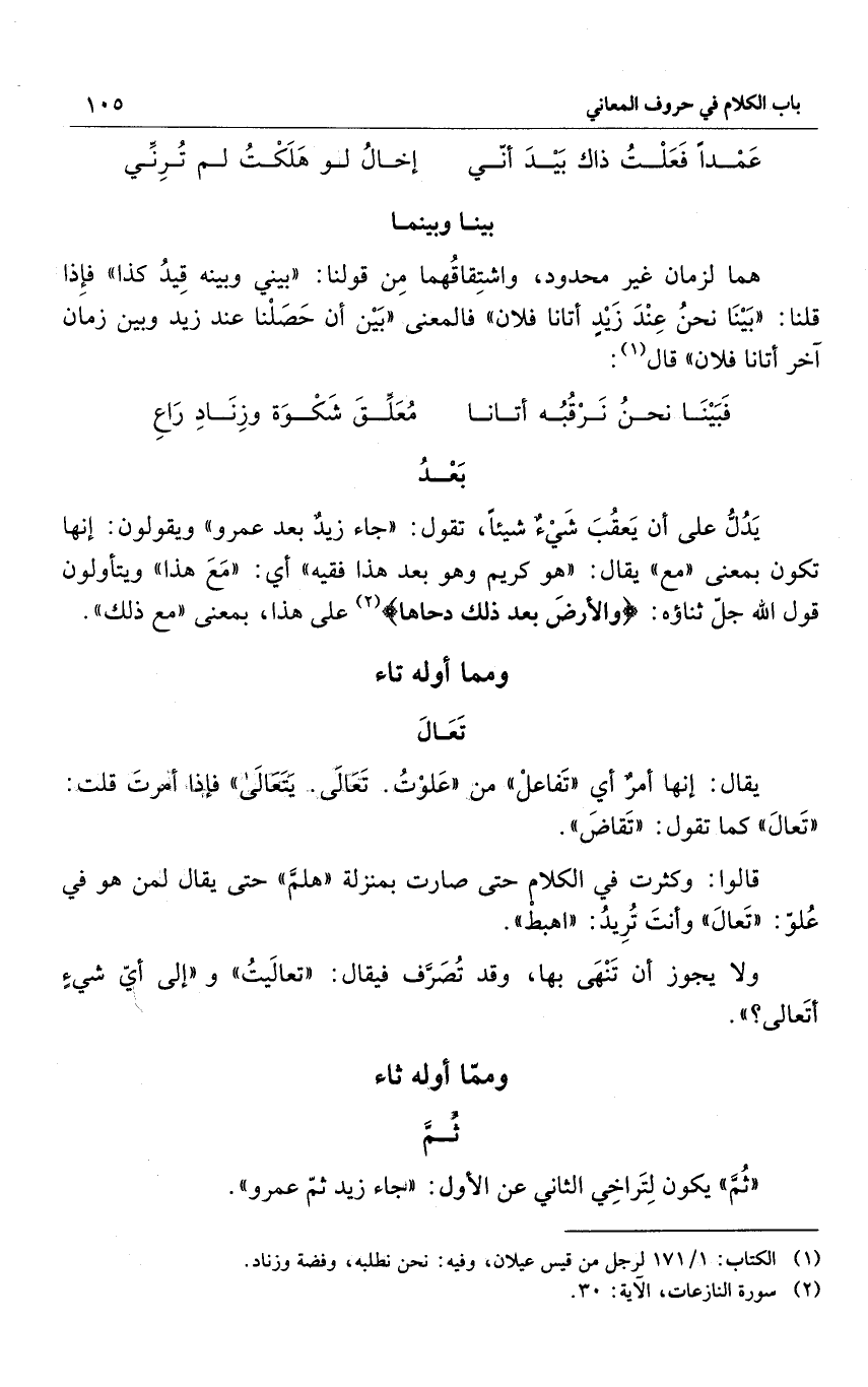 يَدُلُّ عَلَى أن يَعقُبَ شَيْءٌ شيئاً. تقول: "جاء زيدٌ بعد عمرو" ويقولون: إنها تكون بمعنى "مع" يقال: "هو كريم وهو بعد هَذَا فقيه" أي: "مَعَ هَذَا" ويتأولون قول الله جلّ ثناؤه: {وَالْأَرْضَ بَعْدَ ذَلِكَ دَحَاهَا} 2 عَلَى هذا، بمعنى "مع ذَلِكَ".