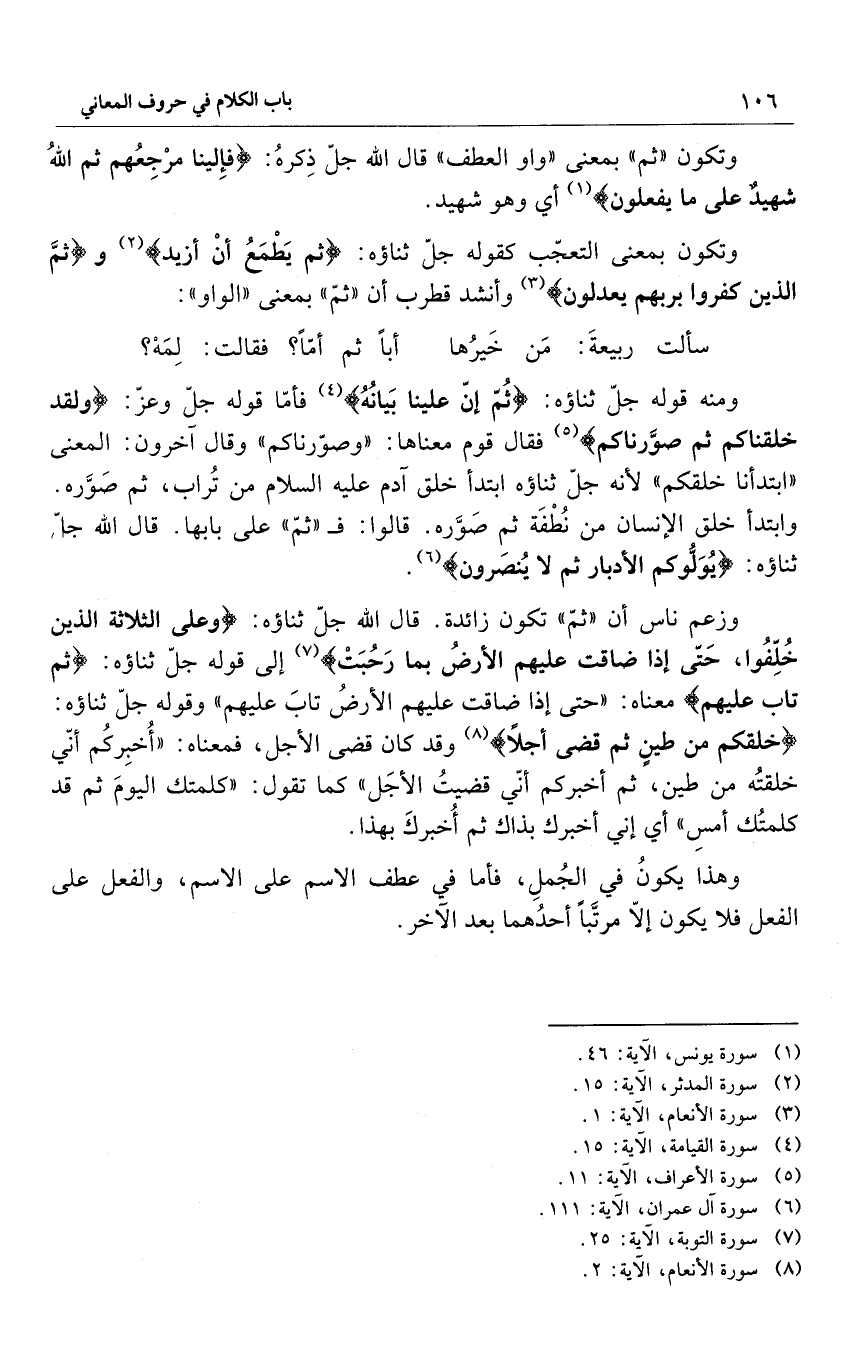 وزعم ناس أن "ثُمَّ" تكون زائدة. قال الله جلّ ثناؤه: {وَعَلَى الثَّلَاثَةِ الَّذِينَ خُلِّفُوا حَتَّى إِذَا ضَاقَتْ عَلَيْهِمُ الْأَرْضُ بِمَا رَحُبَتْ} 7 إِلَى قوله جلّ ثناؤه {ثُمَّ تَابَ عَلَيْهِمْ} معناه: "حَتَّى إذا ضاقت عليهم الأرض تاب عليهم" وقوله جل ثناؤه: {خَلَقَكُمْ مِنْ طِينٍ ثُمَّ قَضَى أَجَلًا} 8 وَقَدْ كَانَ قضى الأجل، فمعناه: "أُخْبِرُكم أني خلقته من طين، ثُمَّ أخبركم أنّي قضَيتُ الأجَل" كما تقول: "كلمتك اليومَ ثُمَّ قَدْ كلمتُك أمسِ" أي إني أخبرك بذاك ثُمَّ أُخبركَ بهذا.