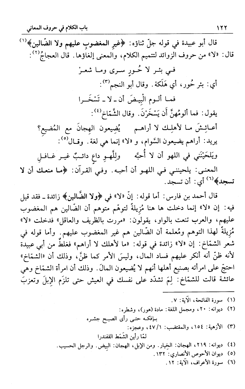 قال أبو عبيدة في قوله جلّ ثناؤه: {غَيْرِ الْمَغْضُوبِ عَلَيْهِمْ وَلا الضَّالِّينَ} 1 قال: "لا" من حروف الزوائد لتتميم الكلام، والمعنى إلغاؤها. قال العجاجُ2: