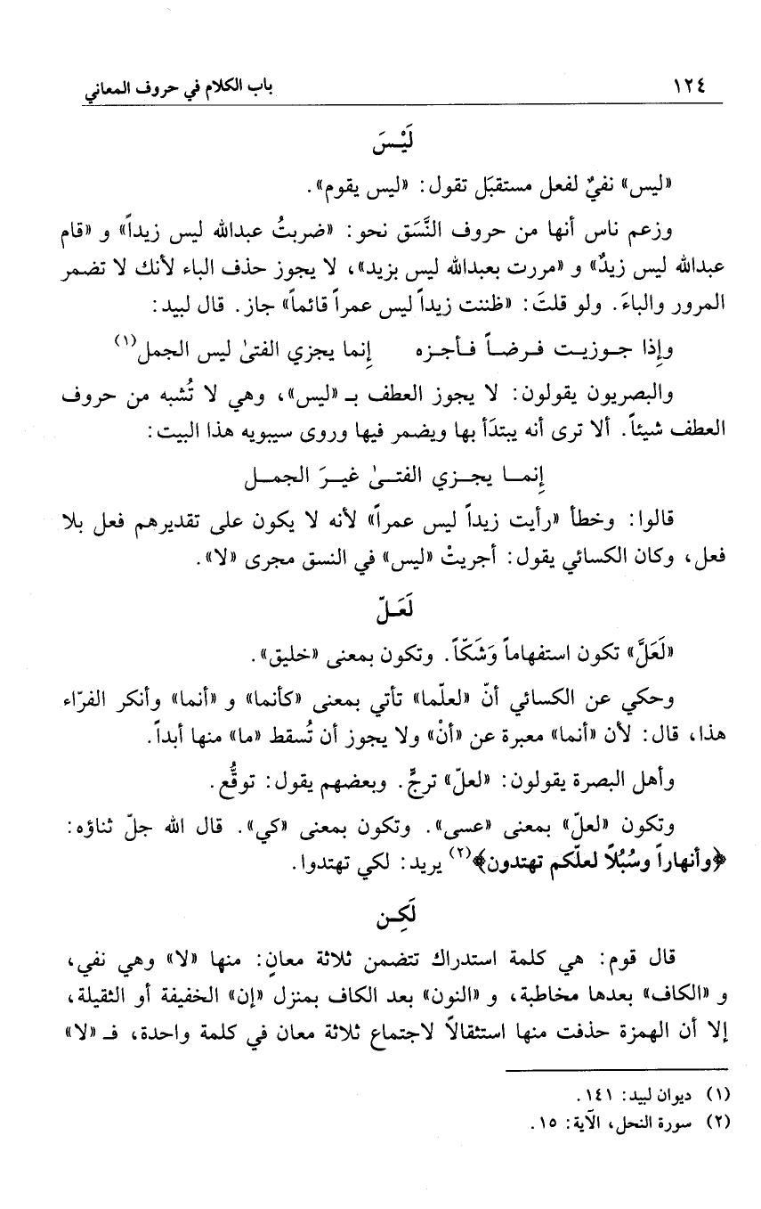 وزعم ناس أنها من حروف النَّسَق نحو: "ضربتُ عبد الله ليس زيداً" و"قام عبد الله ليس زيد" و"مررت بعبد الله ليس بزيد"، لا يجوز حذف الباء لأنك لا تضمر المرور والباءَ. ولو قلتَ: "ظننت زيداً ليس عمراً قائماً" جاز. قال لبيد: