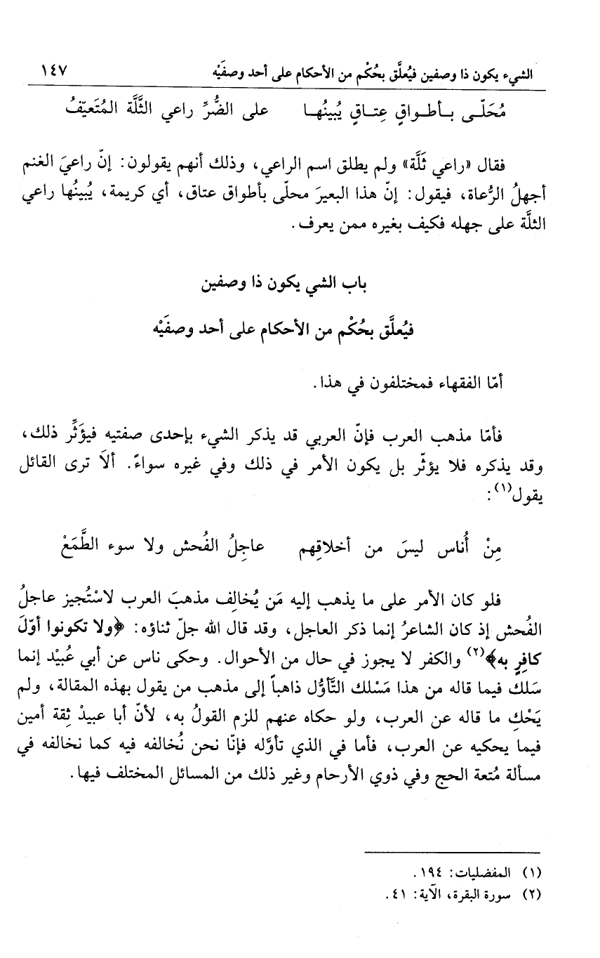 فلو كان الأمر على ما يذهب إليه مَن يُخالِف مذهبَ العرب لاستجيز عاجلُ الفُحش إذا كان الشاعرُ إنما ذكر العاجل، وقد قال الله جلّ ثناؤه: {وَلَا تَكُونُوا أَوَّلَ كَافِرٍ بِهِ} 2 والكفر لا يجوز في حال من الأحوال. وحكى ناس عن أبي عُبيدْ إنما سَلك فيما قاله من هذا مَسْلك التَّأوُّل ذاهباً إلى مذهب من يقول بهذه المقالة، ولم يَحْكِ ما قاله عن العرب، ولو حكاه عنهم للزم القولُ به، لأنّ أبا عبيدْ ثِقة أمين فيما يحكيه عن العرب، فأما في الذي تأوَّله فإنّا نحن نُخالفه فيه كما نخالفه في مسألة مُتعة الحج وفي ذوي الأرحام وغير ذلك من المسائل المختلف فيها.