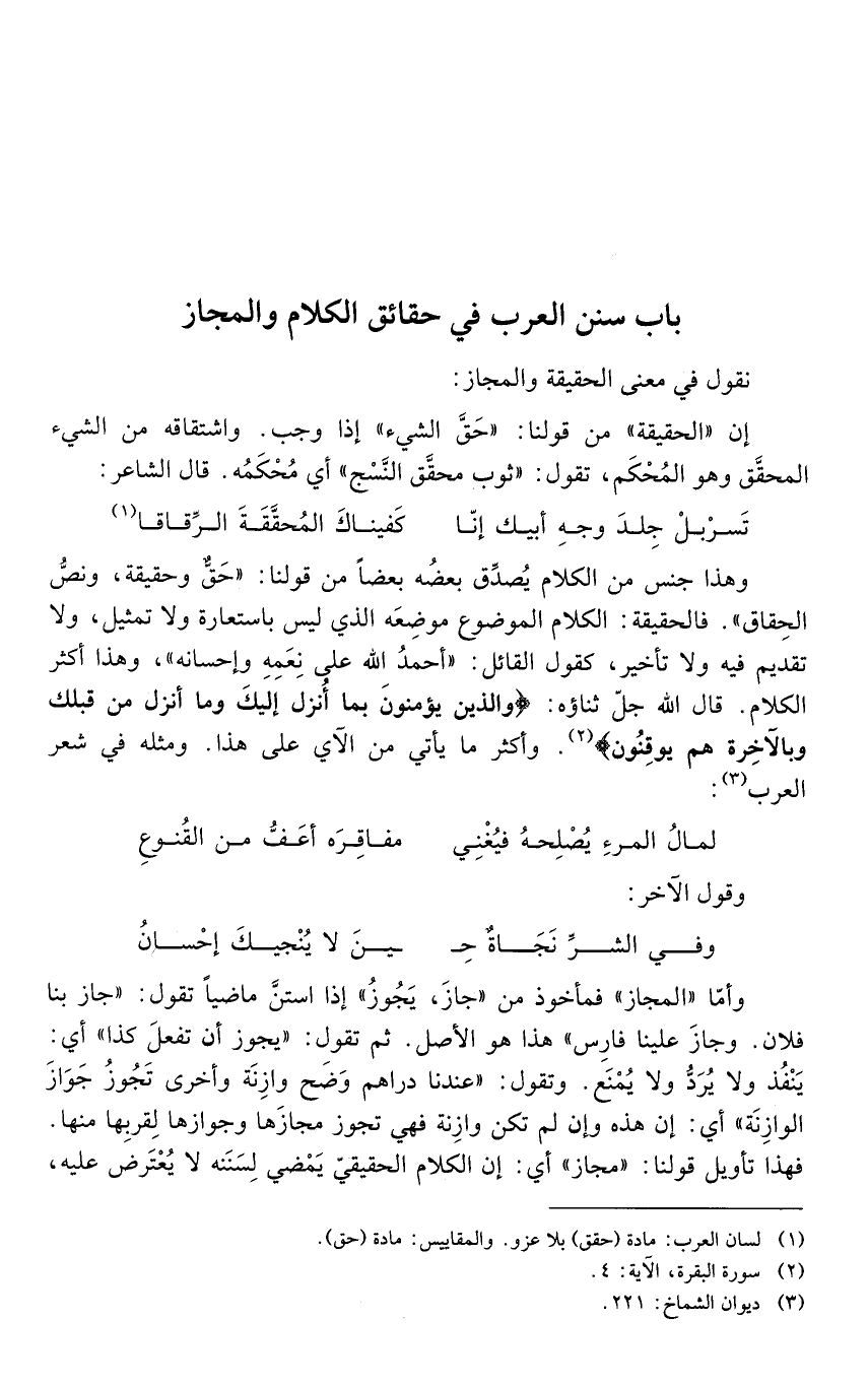 وهذا جنس من الكلام يُصدِّق بعضُه بعضاً من قولنا: "حَقٌّ وحقيقة. ونصُّ الحِقاق". فالحقيقة: الكلام الموضوع موضِعَه الذي ليس باستعارة ولا تمثيل، ولا تقديم فيه ولا تأخير، كقول القائل: "أحمدُ اللهَ على نِعَمِهِ وإحسانه". وهذا أكثر الكلام. قال الله جلّ ثناؤه: {وَالَّذِينَ يُؤْمِنُونَ بِمَا أُنْزِلَ إِلَيْكَ وَمَا أُنْزِلَ مِنْ قَبْلِكَ وَبِالآخِرَةِ هُمْ يُوقِنُونَ} 2 وأكثر ما يأتي من الآي على هذا. ومثله في شعر العرب3: