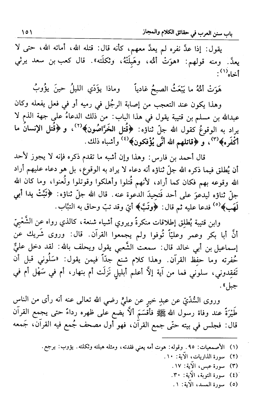 وهذا يكون عند التعجب من إصابة الرجُل في رميْه أو في فعل يفعله وكان عبد الله بن مسلم بن قتيبة يقول في هذا الباب: من ذلك الدعاءُ على جهة الذم لا يراد به الوقوعُ كقوله الله جل ثناؤه: {قُتِلَ الْخَرَّاصُونَ} 2، و {قُتِلَ الْإِنْسَانُ مَا أَكْفَرَهُ} 3. و {قَاتَلَهُمُ اللَّهُ أَنَّى يُؤْفَكُونَ} 4" وأشباه ذلك.