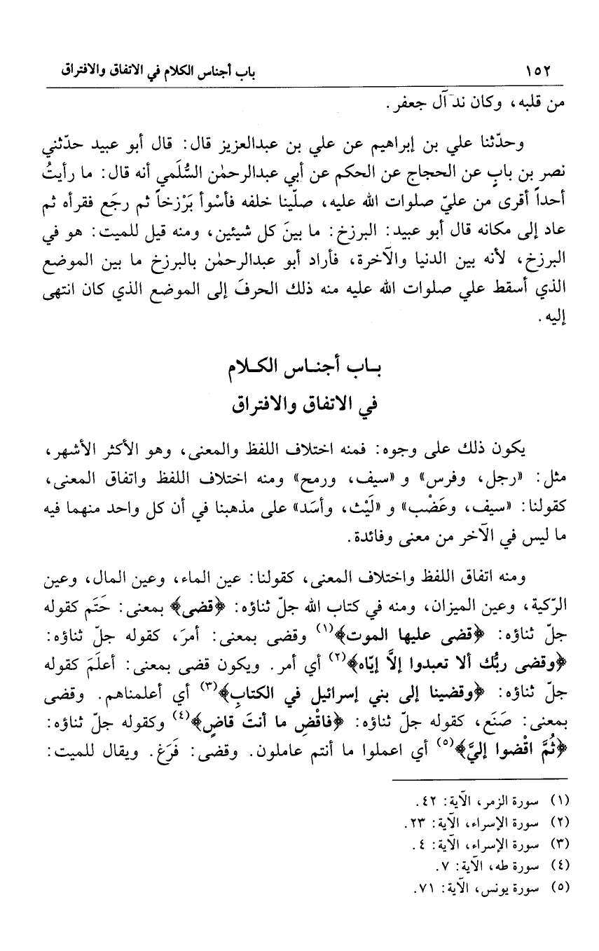 ومنه اتفاق اللفظ واختلاف المعنى، كقولنا عين الماء وعين المال وعين الرّكبة وعين الميزان ومنه في كتاب الله جل ثناؤه: {قَضَى} بمعنى: حَتَم كقوله جلّ ثناؤه {قَضَى عَلَيْهَا الْمَوْتَ} 1 وقضى بمعنى: أمرَ كقوله جلّ ثناؤه: {وَقَضَى رَبُّكَ أَلاَّ تَعْبُدُوا إِلاَّ إِيَّاهُ} 2 أي أمر. ويكون قضى بمعنى: أعَلَم كقوله جلّ ثناؤه: {وَقَضَيْنَا إِلَى بَنِي إسْرائِيلَ فِي الْكِتَابِ} 3 أي أعلمناهم. وقضى بمعنى: صَنَع كقوله جلّ ثناؤه: {فَاقْضِ مَا أَنْتَ قَاضٍ} 4 وكقوله جلّ ثناؤه: {ثُمَّ اقْضُوا إِلَيَّ} 5 أي اعملوا ما أنتم عاملون. وقضى: فَرَغ. ويقال للميت: