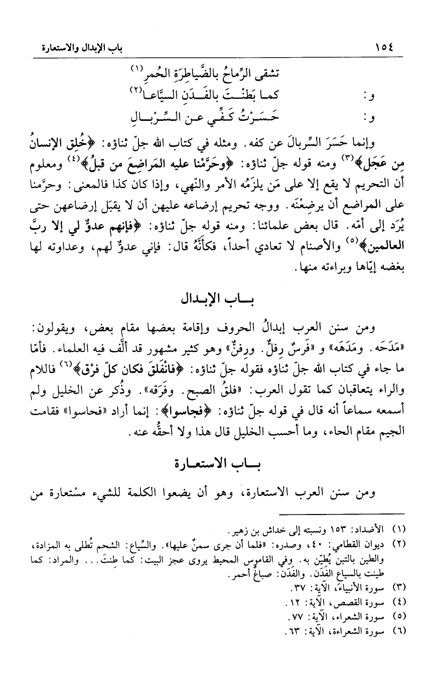 وإنما حَسَرَ السِّربالَ عن كفه. ومثله في كتاب الله جل ثناؤه: {خُلِقَ الْإِنْسَانُ مِنْ عَجَلٍ} 3 ومنه قوله جلّ ثناؤه: {وَحَرَّمْنَا عَلَيْهِ الْمَرَاضِعَ مِنْ قَبْلُ} 4 ومعلوم أن التحريم لا يقع إلا على مَن يلزَمُه الأمر والنّهي، وإذا كان كذا فالمعنى: وحرَّمنا على المراضع أن يرضِعْنَه. ووجه تحريم إرضاعه عليهن أن لا يقبَل إرضاعهن حتى يُرَد إلى أمّه. قال بعض علمائنا: ومنه قوله جل ثناؤه: {فَإِنَّهُمْ عَدُوٌّ لِي إِلَّا رَبَّ الْعَالَمِينَ} 5 والأصنام لا تعادي أحداً، فكأَنَّهُ قال: فإني عدوٌّ لهم. وعداوته لها بغضه إيّاها وبراءته منها.