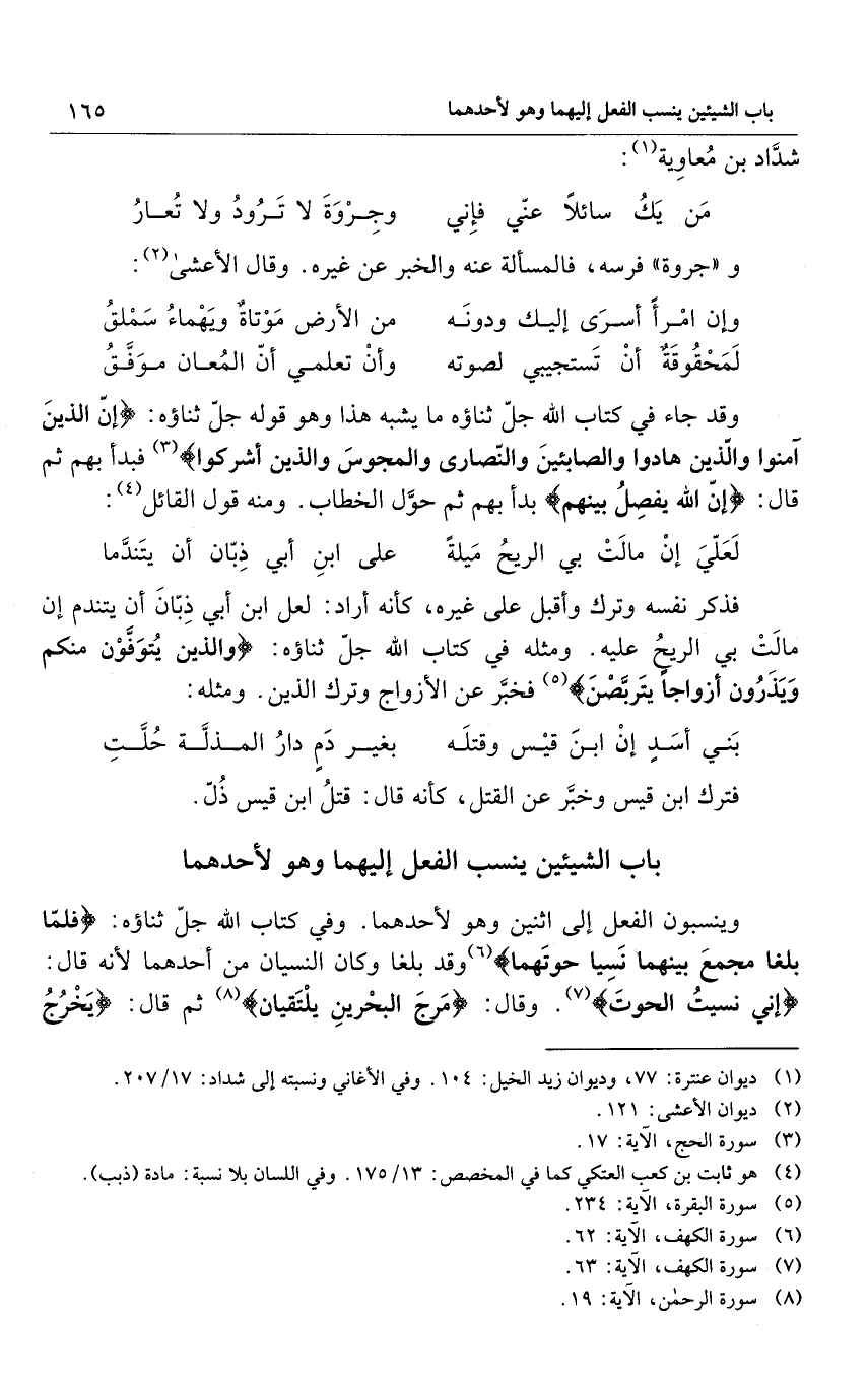 وينسبون الفعل إلى اثنين وهو لأحدهما. وفي كتاب الله جل ثناؤه: {فَلَمَّا بَلَغَا مَجْمَعَ بَيْنِهِمَا نَسِيَا حُوتَهُمَا} 6 وكان النسيان من أحدهما لأنه قال: {إِنِّي نَسِيتُ الْحُوتَ} 7. وقال: {مَرَجَ الْبَحْرَيْنِ يَلْتَقِيَانِ} 8 ثم قال: {يَخْرُجُ