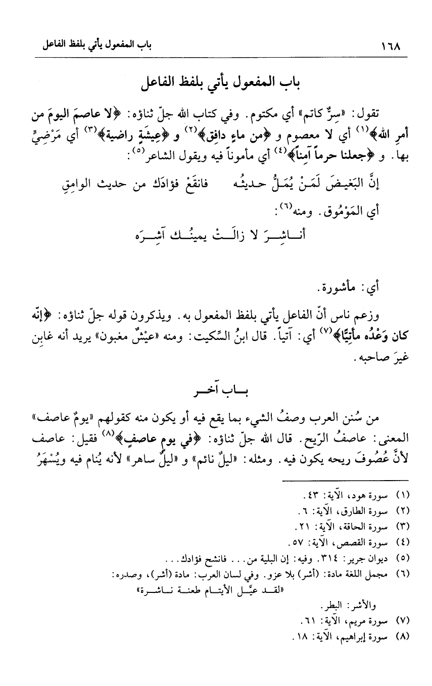 تقول: "سِرُّ كاتم" أي مكتوم. وفي كتاب الله جل ثناؤه: {لَا عَاصِمَ الْيَوْمَ مِنْ أَمْرِ اللَّهِ} 1 أي لا معصوم و {مِنْ مَاءٍ دَافِقٍ} 2 و {عِيشَةٍ رَاضِيَةٍ} 3 أي مَرْضِيٍ بها. و {جَعَلْنَا حَرَمًا آمِنًا} 4 أي مأموناً فيه ويقول الشاعر5: