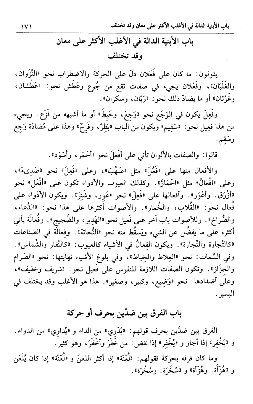 والأفعال منها على "فَعُلَ" مثل "صَهُبَ". وعلى "فَعِلَ" نحو "صدئ". وعلى "أفْعالَّ" مثل "احْمَارٌ". وكذلك العيوب والأدواء تكون على "أفْعَلَ" نحو: "أزْرَق. وأعْوَر". وأفعالها على "فَعِلَ" نحو "عَوِر. وشَتِرَ". ويكون الأدْواء على فُعال نحو: "القُلاب. والخُمار". والأصوات أكثرها على هذا نحو: "الدُّعاء. والصُّراخ". وللأصوات باب آخر على فَعيل نحو "الهَدِير. والضَّجيج". وفُعالَة يأتي أكثره على ما يفضُل عن الشيء ويَسقُط منه نحو "النُّحاتة". وفِعالَة في الصناعات "كالتجارة والنِّجارة". ويكون الفِعالُ في الأشياء كالعيوب: "كالنِّفار والشِّماس". وفي السِّمات: نحو "العِلاط والخِباط"، وفي بلوغ الأشياء نهايتها: نحو "الصّرام والجِزَاز". وتكون الصفات اللازمة للنفوس على فَعيل نحو: "شريف وخفيف"، وعلى أضدادها: نحو "وَضِيع وكبير وصغير". هذا هو الأغلب وقد يختلف في اليسير.