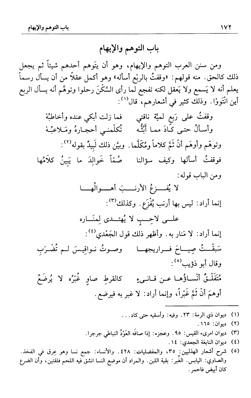 ومن سنن العرب التوهم والإيهام وهو أن يَتوهم أحدهم شيئاً ثم يجعل ذلك كالحق. ومنه قولهم: "وقفتُ بالربْع أسأله" وهو أكمل عقلاً من أن يسأل رسماً يعلم أنه لا يَسمع ولا يَعقل لكنه تفجع لما رأى السِّكْنَ رحلوا وتوهَّم أنه يسأل الربع أن انْتَووْا. وذلك كثير في أشعارهم، قال1: