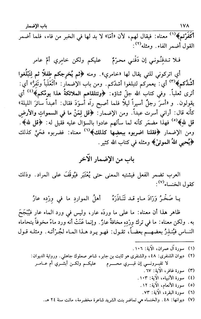العرب تضمر الفعل فيشتبه المعنى حتى يُعْتَبَر فُيوقَفَ على المراد. وذلك كقول الخنساء7: