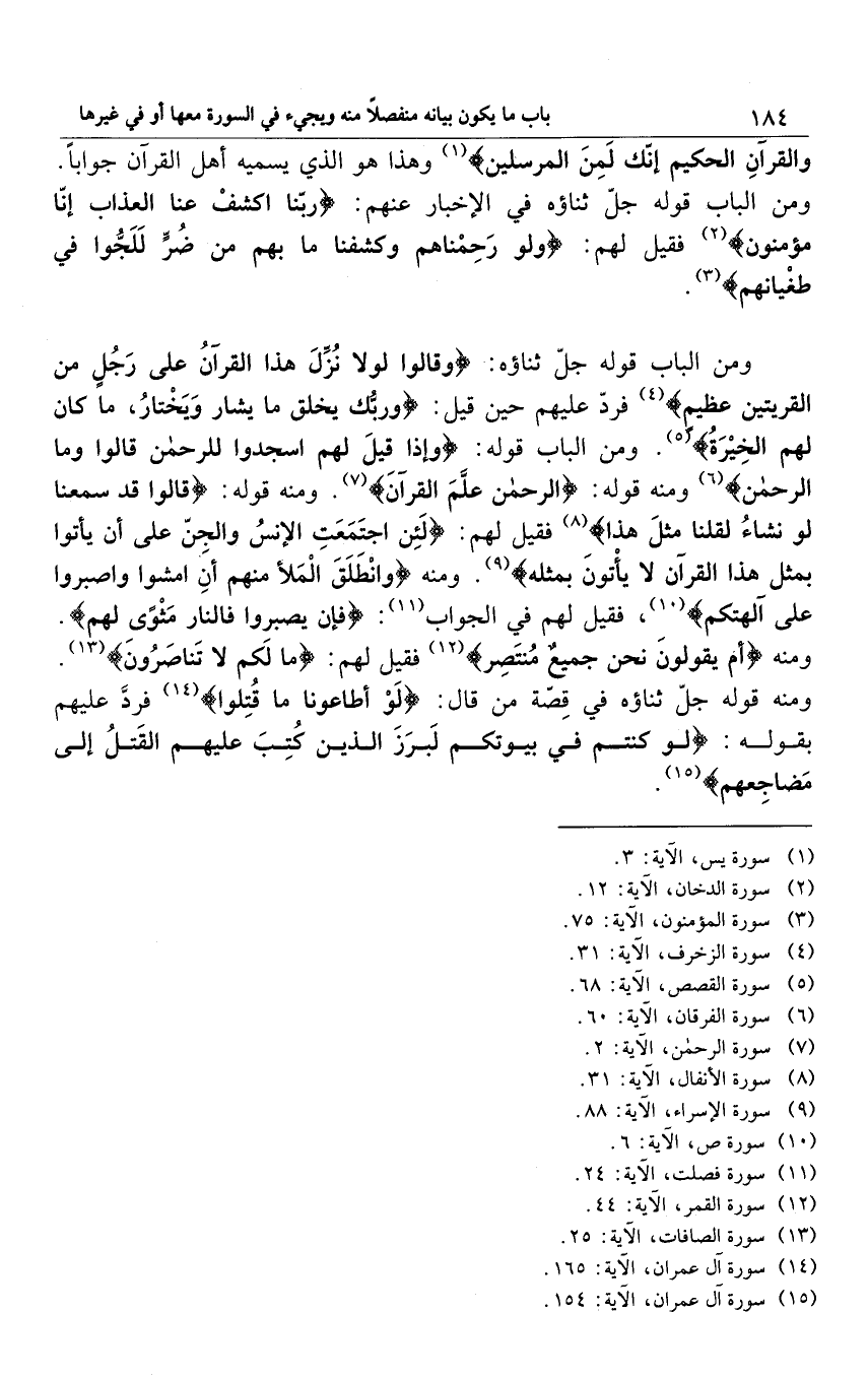 ومن الباب قوله جلّ ثناؤه: {وَقَالُوا لَوْلَا نُزِّلَ هَذَا الْقُرْءانُ عَلَى رَجُلٍ مِنَ الْقَرْيَتَيْنِ عَظِيمٍ} 4 فردّ عليهم حين قيل: {وَرَبُّكَ يَخْلُقُ مَا يَشَاءُ وَيَخْتَارُ مَا كَانَ لَهُمُ الْخِيَرَةُ} 5. ومن الباب قوله: {وَإِذَا قِيلَ لَهُمُ اسْجُدُوا لِلرَّحْمَنِ قَالُوا وَمَا الرَّحْمَنُ} 6 ومنه قوله: {الرَّحْمَنُ، عَلَّمَ الْقُرْآنَ} 7. ومنه قوله: {قَالُوا قَدْ سَمِعْنَا لَوْ نَشَاءُ لَقُلْنَا مِثْلَ هَذَا} 8 فقيل هلم: {لَئِنِ اجْتَمَعَتِ الْإِنْسُ وَالْجِنُّ عَلَى أَنْ يَأْتُوا بِمِثْلِ هَذَا الْقُرْآنِ لَا يَأْتُونَ بِمِثْلِهِ} 9. ومنه {وَانْطَلَقَ الْمَلَأُ مِنْهُمْ أَنِ امْشُوا وَاصْبِرُوا عَلَى آلِهَتِكُمْ} 10 فقيل لهم في الجواب11: {فَإِنْ يَصْبِرُوا فَالنَّارُ مَثْوًى لَهُمْ} ومنه {أَمْ يَقُولُونَ نَحْنُ جَمِيعٌ مُنْتَصِرٌ} 12 فقيل لهم: {مَا لَكُمْ لَا تَنَاصَرُونَ} 13. ومنه قوله جل ثناؤه في قصة من قال: {لَوْ أَطَاعُونَا مَا قُتِلُوا} 14 فردَّ عليهم بقوله: {لَوْ كُنْتُمْ فِي بُيُوتِكُمْ لَبَرَزَ الَّذِينَ كُتِبَ عَلَيْهِمُ الْقَتْلُ إِلَى مَضَاجِعِهِمْ} 15.