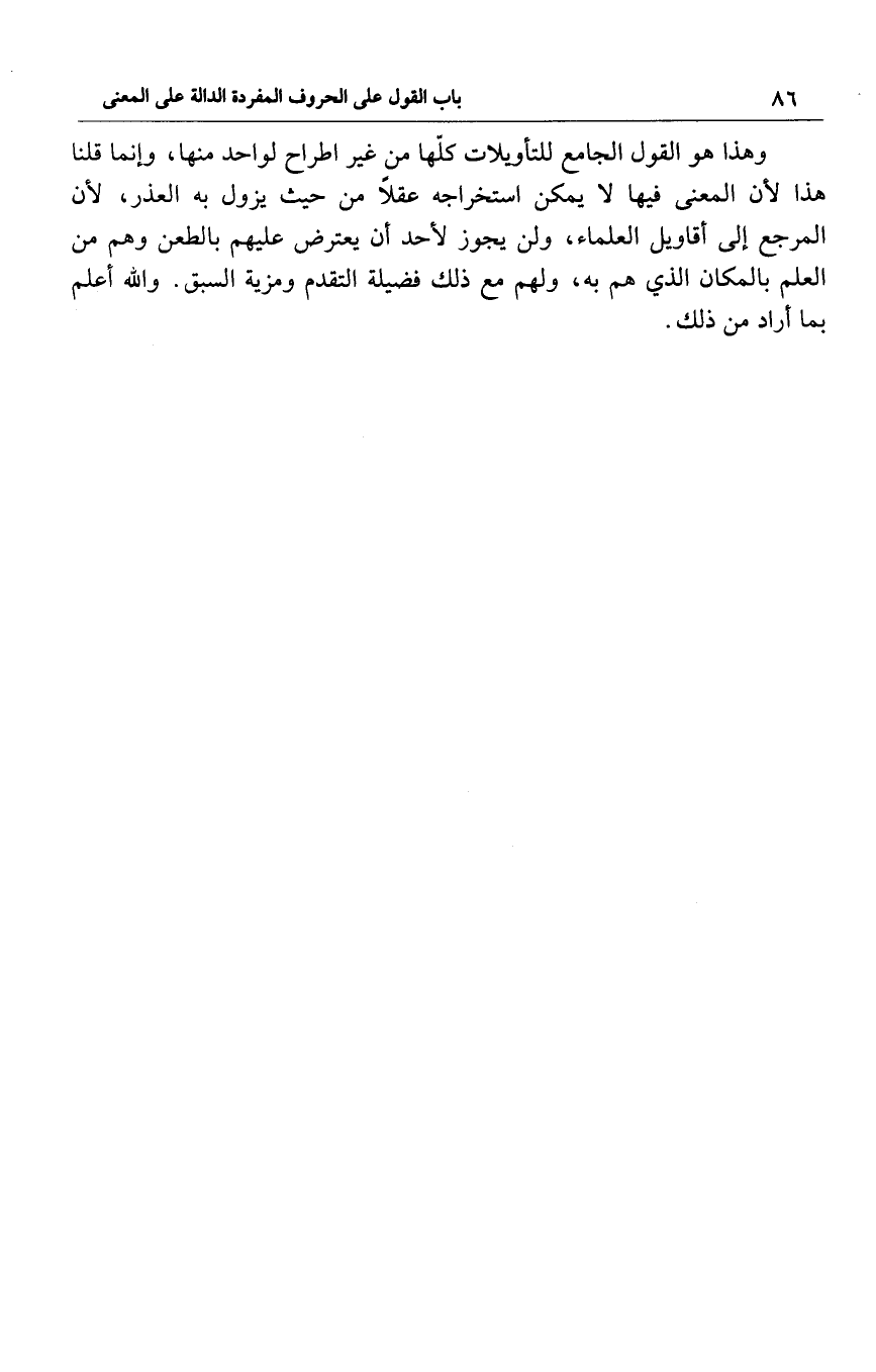 وهذا هو القول الجامع للتأويلات كلّها من غير اطراح لواحد منها، وإنما قلنا هَذَا لأن المعنى فِيهَا لا يمكن استخراجه عقلاً من حَيْثُ يزول بِهِ العذر، لأن المرجع إلى أقاويل العلماء، ولن يجوز لأحد أن يعترض عليهم بالطعن وهم من العلم بالمكان الَّذِي هم بِهِ ولهم مع ذَلِكَ فضيلة التقدم ومزية السبق. والله أعلم بما أراد من ذَلِكَ.