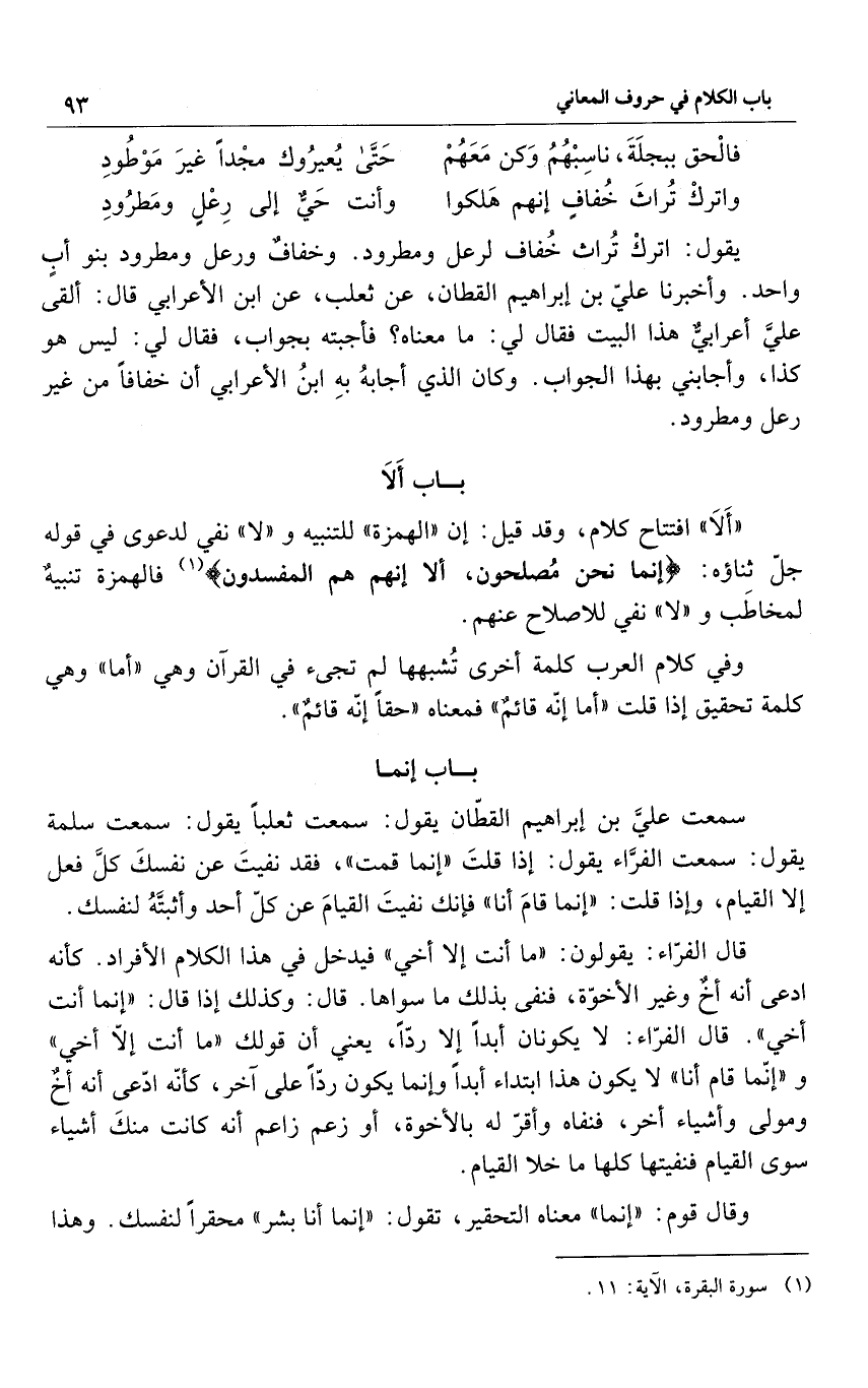 سمعت عليَّ بن إبراهيم القطّان يقول: سمعت ثعلباً يقول: سمعت سلمة يقول: سمعت الفرَّاء يقول: إذا قلتَ: "إنما قمت" فقد نفيتَ عن نفسكَ كلَّ فعل إلا القيام، وإذا قلت: "إنما قامَ أنا" فإنك نفيتَ القيامَ عن كلّ أحد وأثبتَّهُ لنفسك.