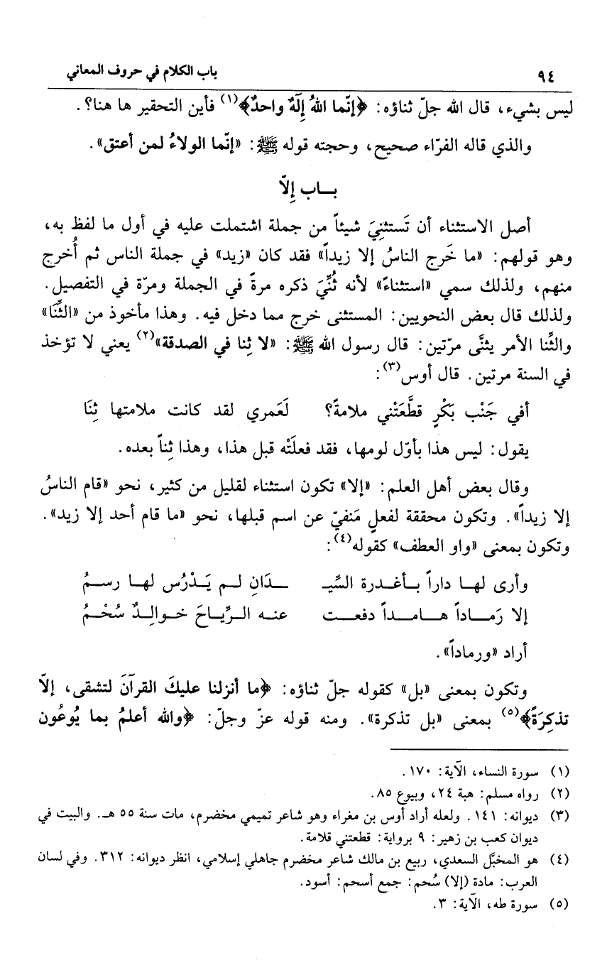 أصل الاستثناء أن تَستثني شيئاً من جملة اشتملت عَلَيْهِ فِي أول مَا لفظ به، وهو قولهم: "مَا خرج الناسُ إلا زيداً" فقد كَانَ "زيد" فِي جملة الناس ثُمَّ أُخرج منهم، ولذلك سمي "استثناءً لأنه ثُنِّيَ ذكره مرةً فِي الجملة ومرّة فِي التفصيل. ولذلك قال بعض النحويين: المستثنى خرج مما دخل فيه، وهذا مأخوذ من "الثِّنَا" والثِّنا الأمر يثَّنى مرّتين: قال رسول الله -صلى الله عليه وسلم: "لا ثِنا فِي الصدقة" 2 يعني لا تؤخذ فِي السنة مرتين. قال أوس3: