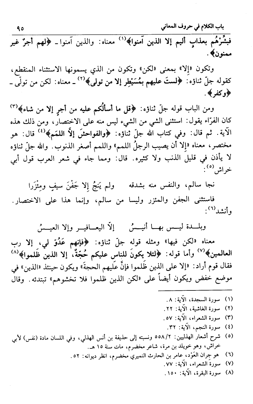 ومن الباب قوله جلّ ثناؤه: {قُلْ مَا أَسْأَلُكُمْ عَلَيْهِ مِنْ أَجْرٍ إِلَّا مَنْ شَاءَ} 3 كَانَ الفرّاء يقول: استثنى الشيء من الشيء لَيْسَ منه على الاختصار، ومن ذَلِكَ هَذِهِ الآية. ثُمَّ قال: وَفِي كتاب الله جل ثناؤه: {وَالْفَوَاحِشَ إِلَّا اللَّمَمَ} 4 قال: هو مختصر، معناه "إلا أن يصيب الرجلُ اللمم" واللمم الذنوب. والله جلّ ثناؤه لا يأذن فِي قليل الذنب ولا كثيره. قال: ومما جاء فِي شعر العرب قول أبي خراش5: