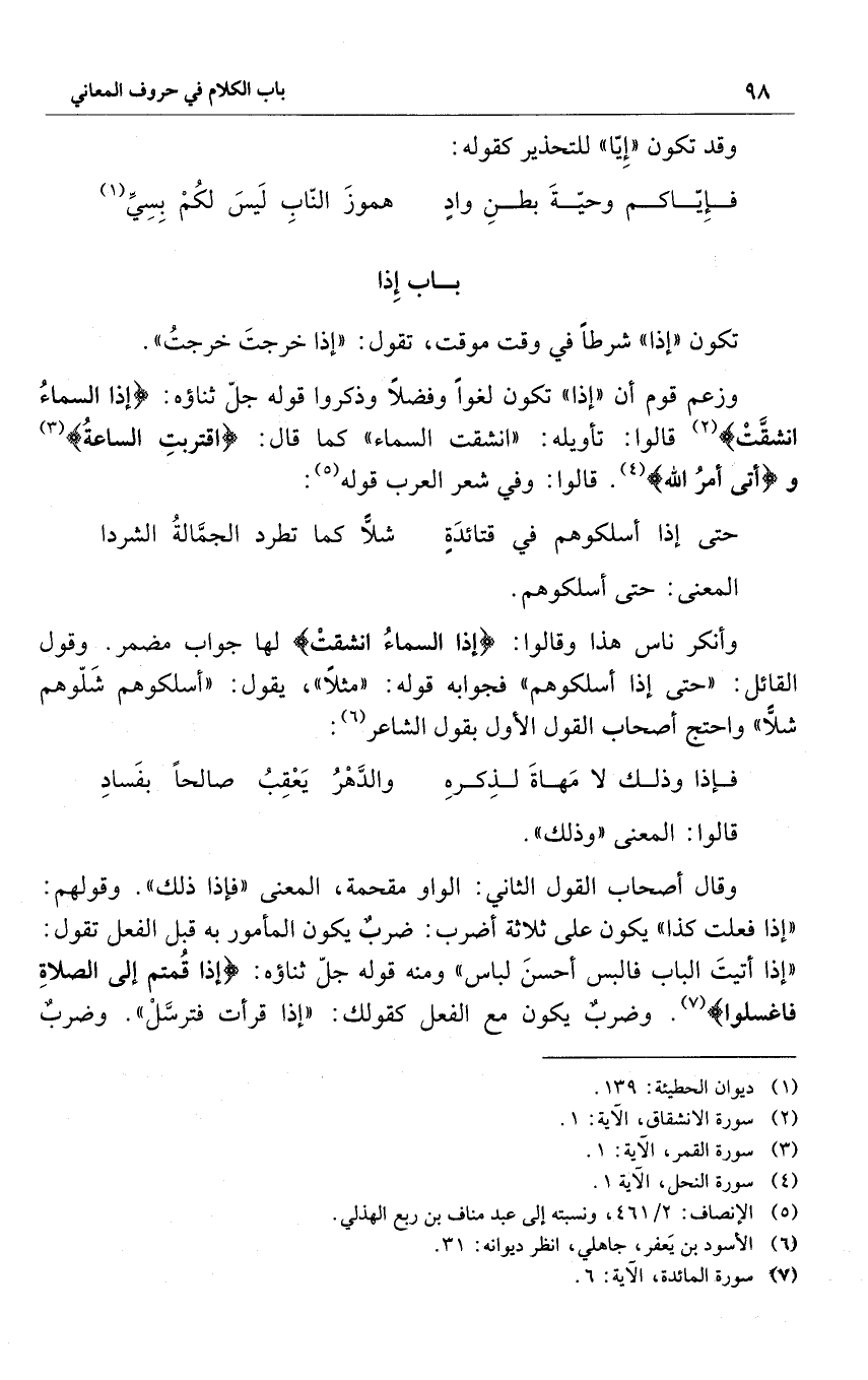 وزعم قوم أن "إذا" تكون لغواً وفضلاً وذكروا قوله جلّ ثناؤه: {إِذَا السَّمَاءُ انْشَقَّتْ} 2 قالوا: تأويله: "انشقت السماء" كما قال: {اقْتَرَبَتِ السَّاعَةُ} 3 و {أَتَى أَمْرُ اللَّهِ} 4. قالوا: وَفِي شعر العرب قوله5: