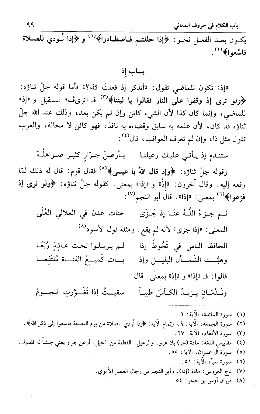 إذ تكون للماضي تقول: "أتذكر إذ فعلتَ كذا?" فأما قوله جلّ ثناؤه: {وَلَوْ تَرَى إِذْ وُقِفُوا عَلَى النَّارِ فَقَالُوا يَا لَيْتَنَا} 3 فـ"ترى" مستقبل و"إذ" للماضي، وإنما كَانَ كذا لأن الشيء كائن وإن لَمْ يكن بعد، وذلك عند الله جلّ ثناؤه، قَدْ كَانَ، لأن علمه بِهِ سابق وقضاءه بِهِ نافذ فهو كائن لا محالة، والعرب تقول مثل ذا وإن لَمْ تعرف العواقب. قال4: