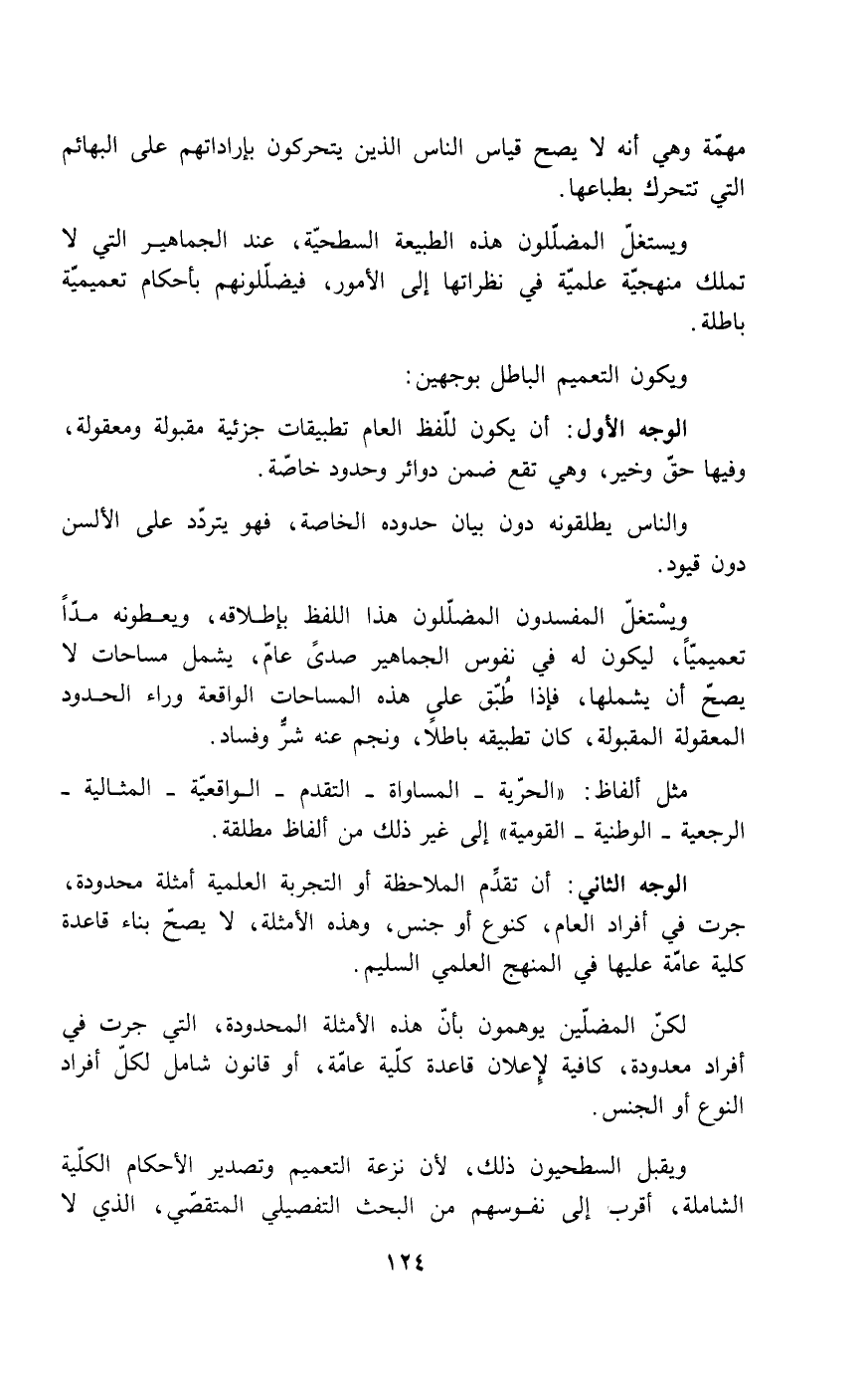 ويستغل المضللون هذه الطبيعة السطحية، عند الجماهير التي لا تملك منهجية علمية في نظراتها إلى الأمور، فيضللونهم بأحكام تعميمية باطلة.