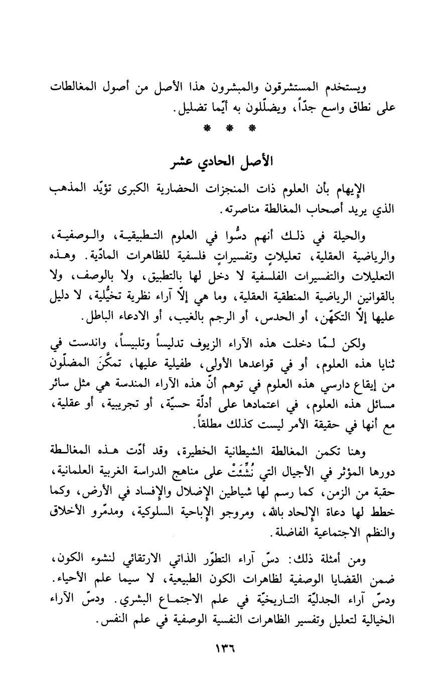 ولكن لما دخلت هذه الآراء زيوفاً وتدليساً وتلبيساً، واندست في ثنايا هذه العلوم، أو في قواعدها الأولى، طفيلية عليها، تمكَّن المضلون من إيقاع دارسي هذه العلوم في توهم أن هذه الآراء المندسة هي مثل سائر مسائل هذه العلوم، في اعتمادها على أدلة حسية، أو تجريبية، أو عقلية، مع أنها في حقيقة الأمر ليست كذلك مطلقاً.