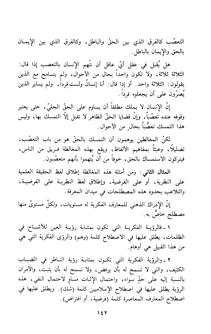 هل يُقبل في عقل أي عاقل أن نتهم الإنسان بالتعصب إذا قال: الثلاثة ثلاثة، ولا تكون واحداً بحالٍ من الأحوال، ولم يتسامح مع الذين يقولون: الثلاثة واحد. أو إذا قال: أنا إنسان ولست قرداً، ولم يساير الذين يصرون على أن يجعلوه قرداً.