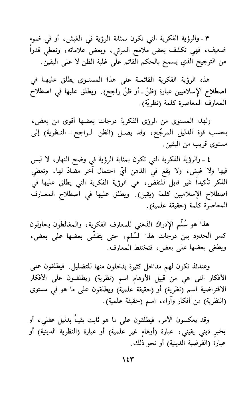 4- والرؤية الفكرية التي تكون بمثابة الرؤية في وضح النهار، لا لبس فيها ولا غبش، ولا يقع في الذهن أي احتمال آخر مضاد لها، وتعطي الفكر تأكيداً غير قابل للنقض، هي الرؤية الفكرية التي يطلق عليها في اصطلاح الإسلاميين كلمة (يقين) . ويطلق عليها في اصطلاح المعارف المعاصرة كلمة (حقيقة علمية) .