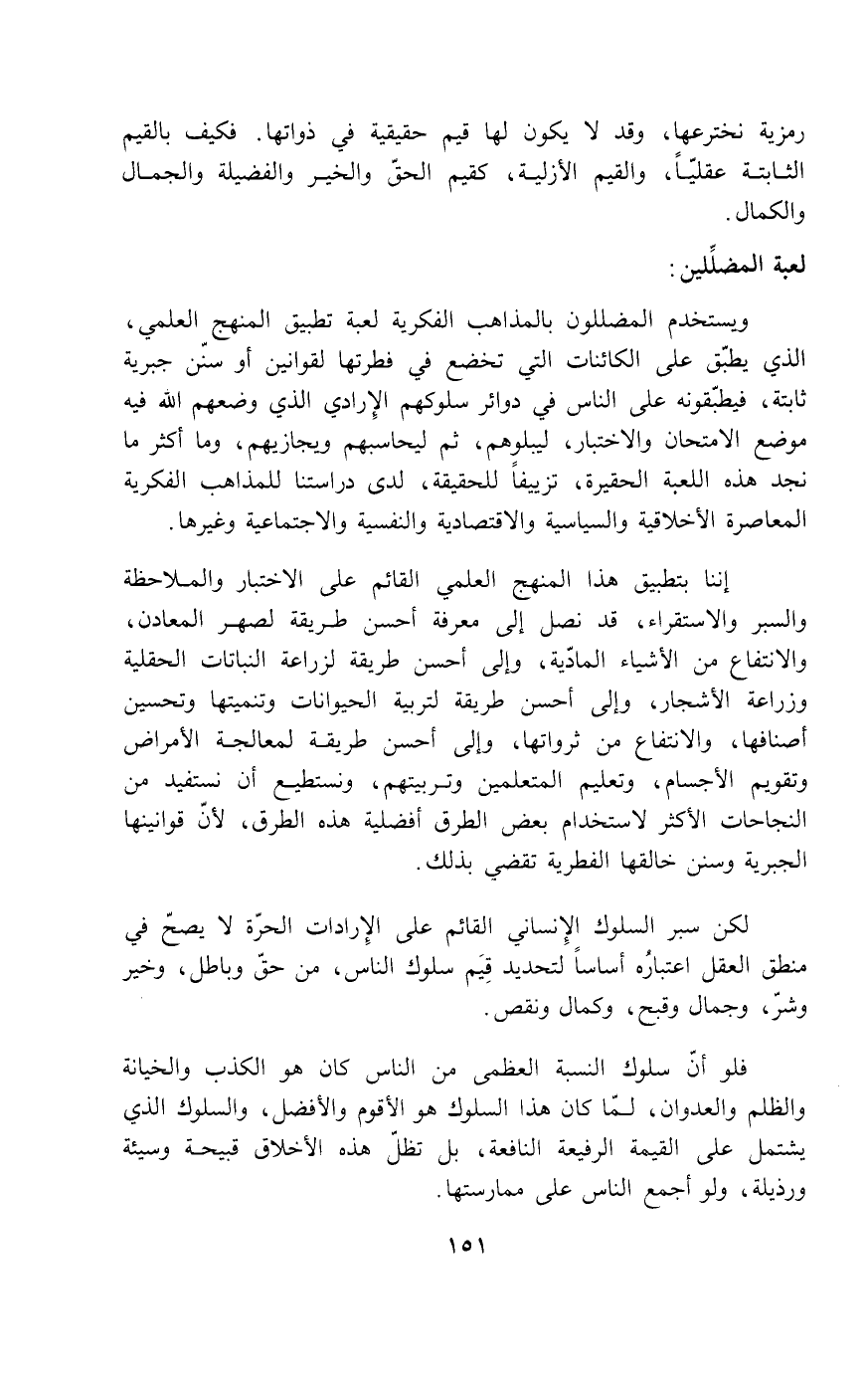 ويستخدم المضللون بالمذاهب الفكرية لعبة تطبيق المنهج العلمي، الذي يطبق على الكائنات التي تخضع في فطرتها لقوانين أو سنن جبرية ثابتة، فيطبقونه على الناس في دوائر سلوكهم الإرادي الذي وضعهم الله فيه موضع الامتحان والاختبار، ليبلوهم، ثمّ ليحاسبهم ويجازيهم، وما أكثر ما نجد هذه اللعبة الحقيرة، تزييفاً للحقيقة، لدى دراستنا للمذاهب الفكرية المعاصرة الأخلاقية والسياسية والاقتصادية والنفسية والاجتماعية وغيرها.
