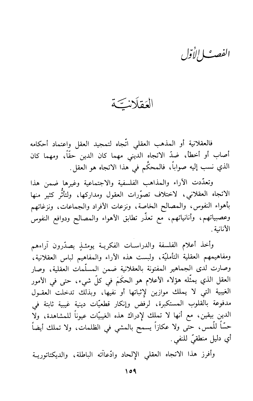 فالعقلانية أو المذهب العقلي اتّجاه لتمجيد العقل واعتماد أحكامه أصاب أو أخطأ، ضدّ الاتجاه الديني مهما كان الدين حقّاً، ومهما كان الذي نسب إليه صواباً، فالمحكَّم في هذا الاتجاه هو العقل.
