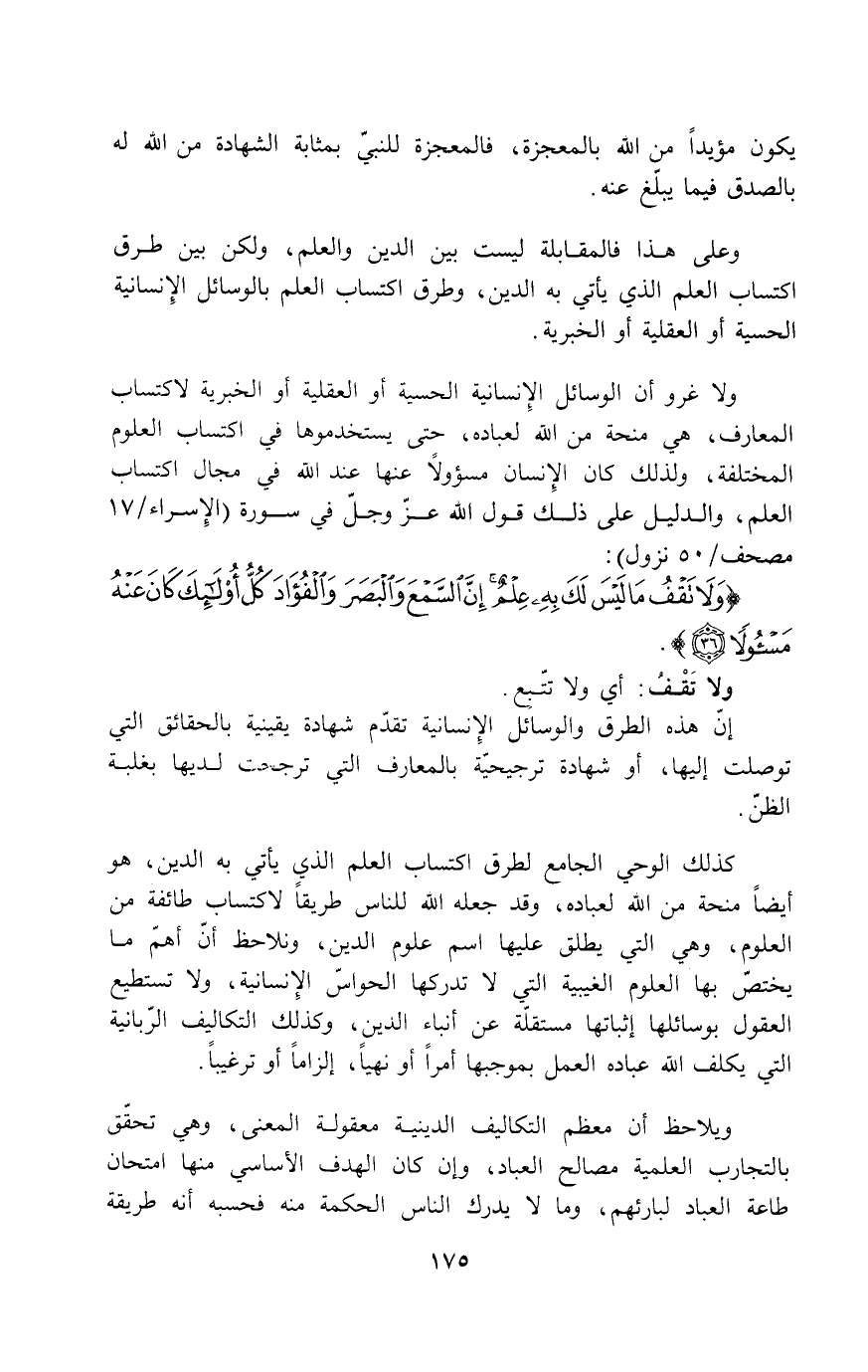 ولا غرو أن الوسائل الإنسانية الحسية أو العقلية أو الخبرية لاكتساب المعارف، وهي منحة من الله لعباده، حتى يستخدموها في اكتساب العلوم المختلفة، ولذلك كان الإنسان مسؤولاً عنها عند الله في مجال اكتساب العلم، والدليل على ذلك قول الله عزّ وجلّ في سورة (الإسراء/17 مصحف/50 نزول) :