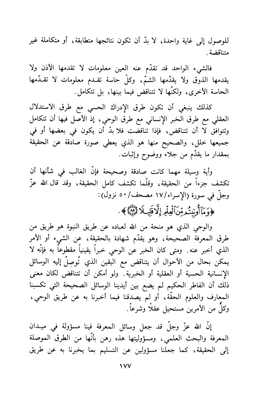 إن الله عزّ وجلّ قد جعل وسائل المعرفة فينا مسؤولة في ميدان المعرفة والبحث العلمي، ومسؤوليتها هذه رهن بأنها من الطرق الموصلة إلى الحقيقة، كما جعلنا مسؤولين عن التسليم بما يخبرنا به عن طريق