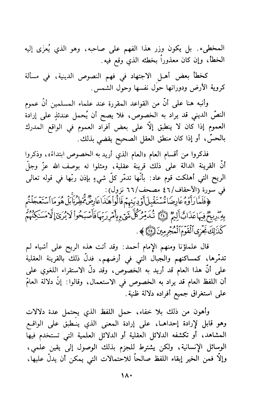 قال علماؤنا ومنهم الإمام أحمد: وقد أتت هذه الريح على أشياء لم تدمرها، كمساكنهم والجبال التي في أرضهم، فدل ذلك بالقرينة العقلية على أن هذا اللفظ العام قد يراد به الخصوص في الاستعمال، وقالوا: إن دلالة العام على استغراق جميع أفراده دلالة ظنية.