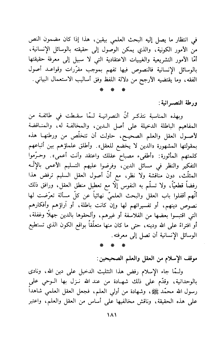 وبهذه المناسبة نتذكر أن النصرانية لما سقطت في طائفة من المفاهيم الباطلة الدخيلة على أصل الدين، والمخالفة له، والمناقضة لأصول العقل والعلم الصحيح، حاولت أن تتخلص من ورطتها هذه بمقولتها المشهورة "الدين لا يخضع للعقل". وأطلق علماؤهم بين أتباعهم كلمتهم المأثورة: "أطفئ مصباح عقلك واعتقد وأنت أعمى". وحرموا التفكير والنظر في مسائل الدين، وفرضوا عليهم التسليم الأعمى بالإله المثلث، دون مناقشة ولا نظر، مع أن أصول العقل السليم ترفض هذا رفضاً قطعياً، ولا تسلم به النفوس إلا مع تعطيل منطق العقل، ورافق ذلك أنهم أقفلوا باب العقل والبحث العلمي نهائياً عن كل مسألة تعرضت لها نصوص دينهم، أو تفسيراتهم لها وإن كانت باطلة، أو آراؤهم وأفكارهم التي اقتبسوا بعضها من الفلاسفة أو غيرهم، وألحقوها بالدين جهلاً وغفلة، أو افتراءً على الله ودينه، حتى ما كان منها متعلقاً بواقع الكون الذي تستطيع الوسائل الإنسانية أن تصل إلى معرفته.