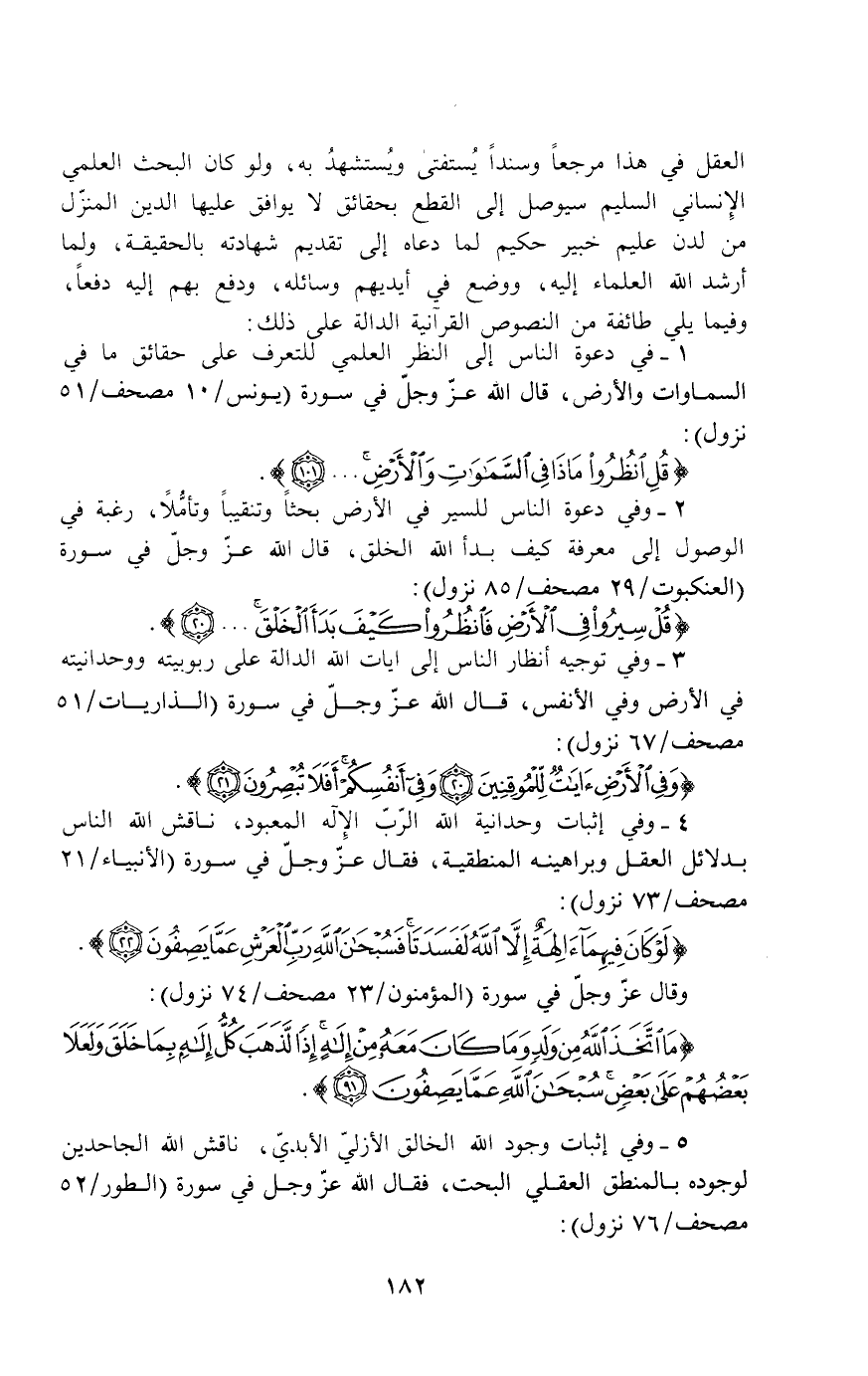 العقل في هذا مرجعاً وسناً يستفتى ويستشهد به، ولو كان البحث العلمي الإنساني السليم سيوصل إلى القطع بحقائق لا يوافق عليها الدين المنزل من لدن عليم خبير حكيم لما دعاه إلى تقديم شهادته بالحقيقة، ولما أرشد الله العلماء إليه، ووضع في أيديهم وسائله، ودفع بهم إليه دفعاً، وفيما يلي طائفة من النصوص القرآنية الدالة على ذلك: