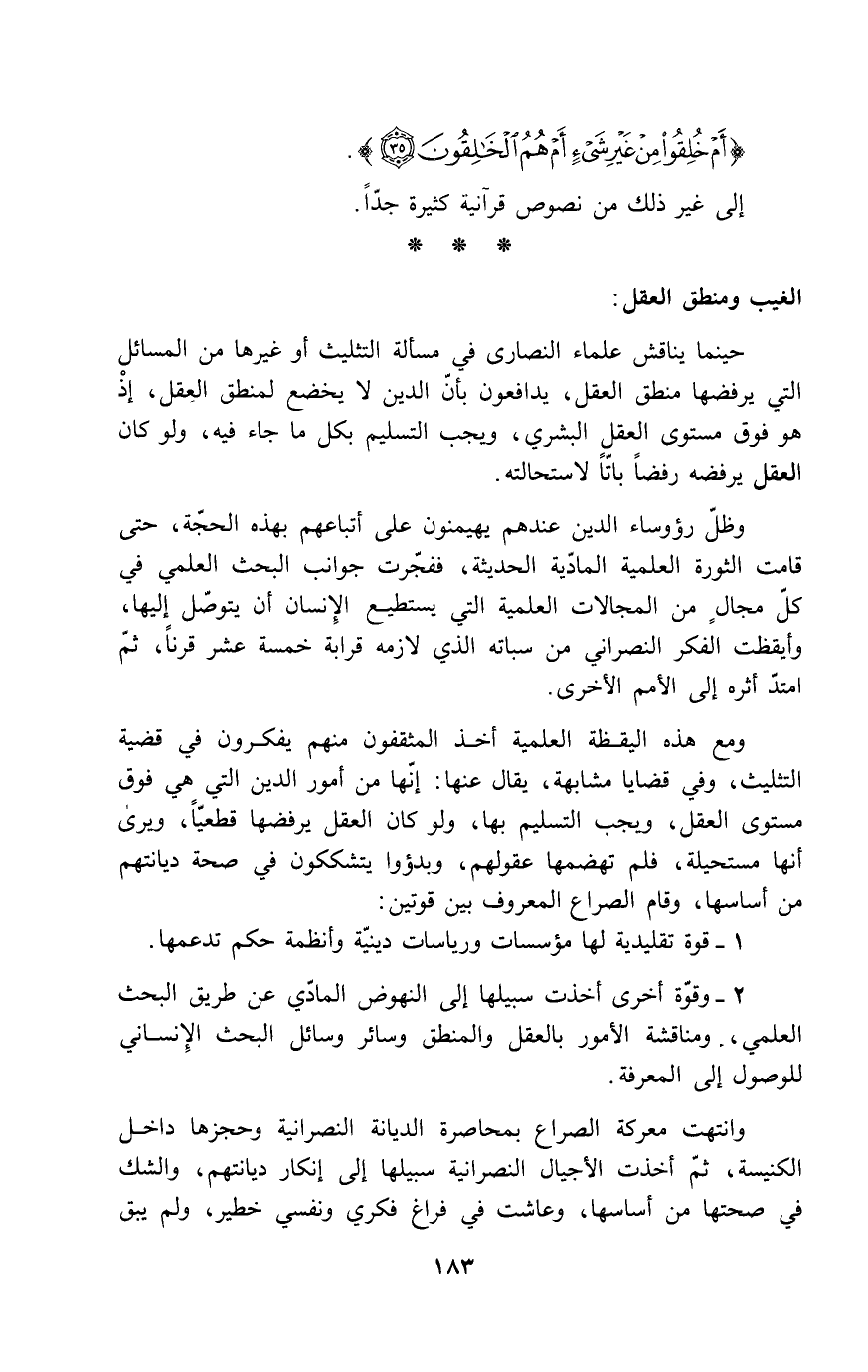 حينما يناقش علماء النصارى في مسألة التثليث أو غيرها من المسائل التي يرفضها منطق العقل، يدافعون بأن الدين لا يخضع لمنطق العقل، إذ هو فوق مستوى العقل البشري، ويجب التسليم بكل ما جاء فيه، ولو كان العقل يرفضه رفضاً باتاً لاستحالته.