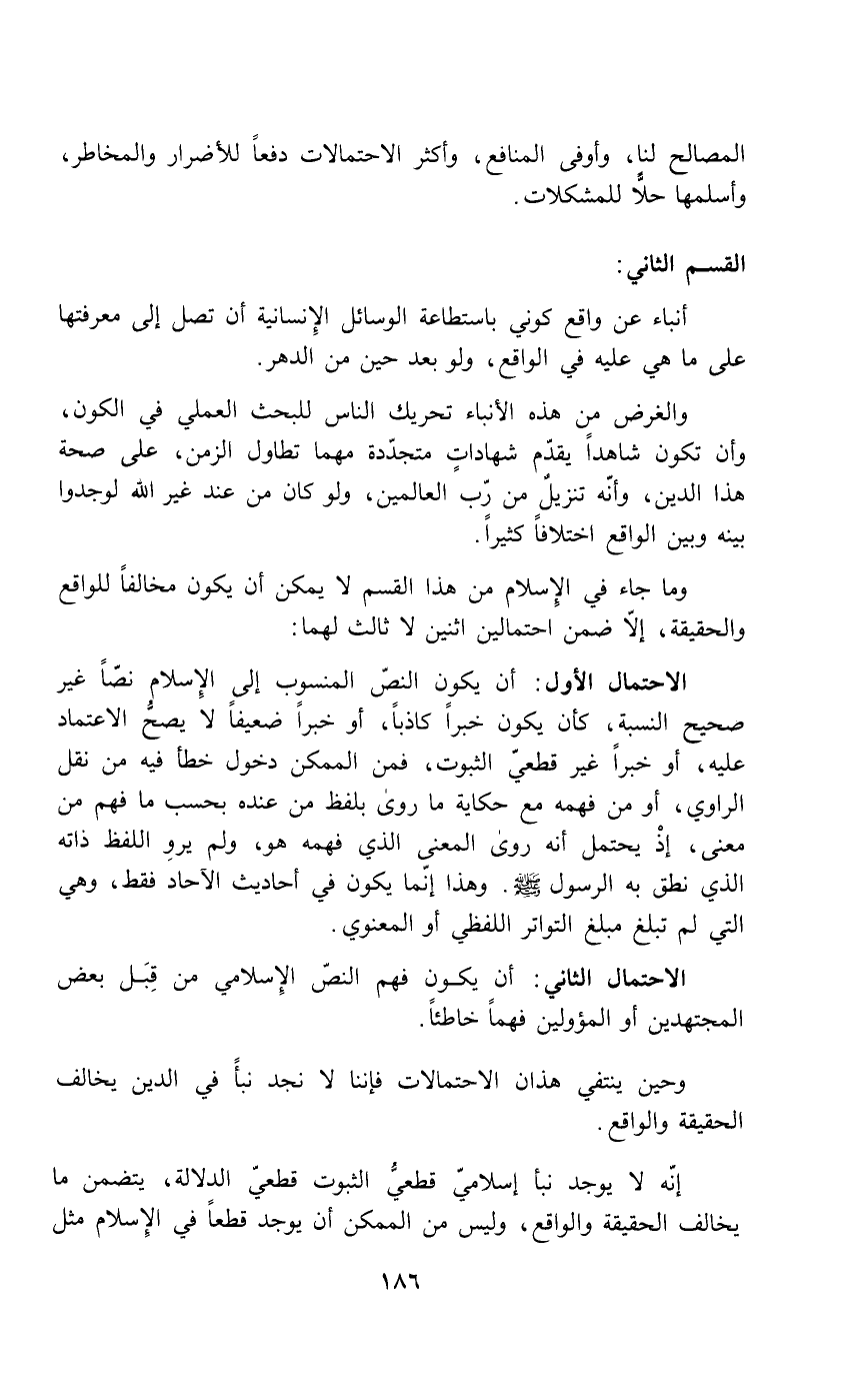إنه لا يوجد نبأ إسلامي قطعي الثبوت قطعي الدلالة، يتضمن ما يخالف الحقيقة والواقع، وليس من الممكن أن يوجد قطعاً في الإسلام مثل