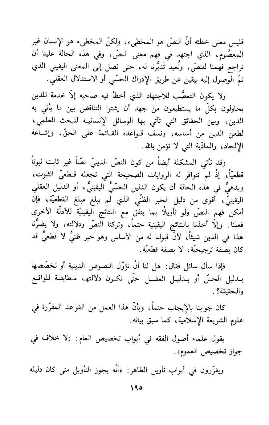 فليس معنى خطئه أن النص هو المخطئ، ولكن المخطئ هو الإنسان غير المعصوم، الذي اجتهد في فهم معنى النص، وفي هذه الحالة علينا أن نراجع فهمنا للنص، ونعيد تدبرنا له، حتى نصل إلى المعنى اليقيني الذي تم الوصول إليه بيقين عن طريق الإدراك الحسي أو الاستدلال العقلي.