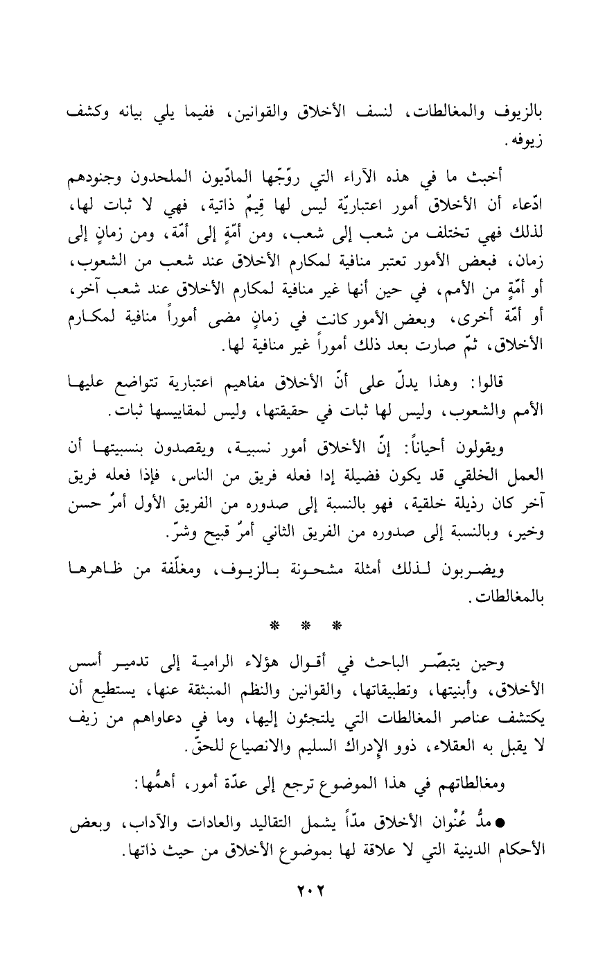 أخبث ما في هذه الآراء التي روجها الماديون الملحدون وجنودهم ادعاء أن الأخلاق أمور اعتبارية ليس لها قيمُ ذاتية، فهي لا ثبات لها، لذلك فهي تختلف من شعب إلى شعب، ومن أمةٍ إلى أمة، ومن زمانٍ إلى زمان، فبعض الأمور تعتبر منافية لمكارم الأخلاق عند شعب آخر، أو أمةٍ أخرى، وبعض الأمور كانت في زمانٍ مضى أموراً منافيةً لمكارم الأخلاق، ثمّ صارت بعد ذلك أموراً غير منافية لها.
