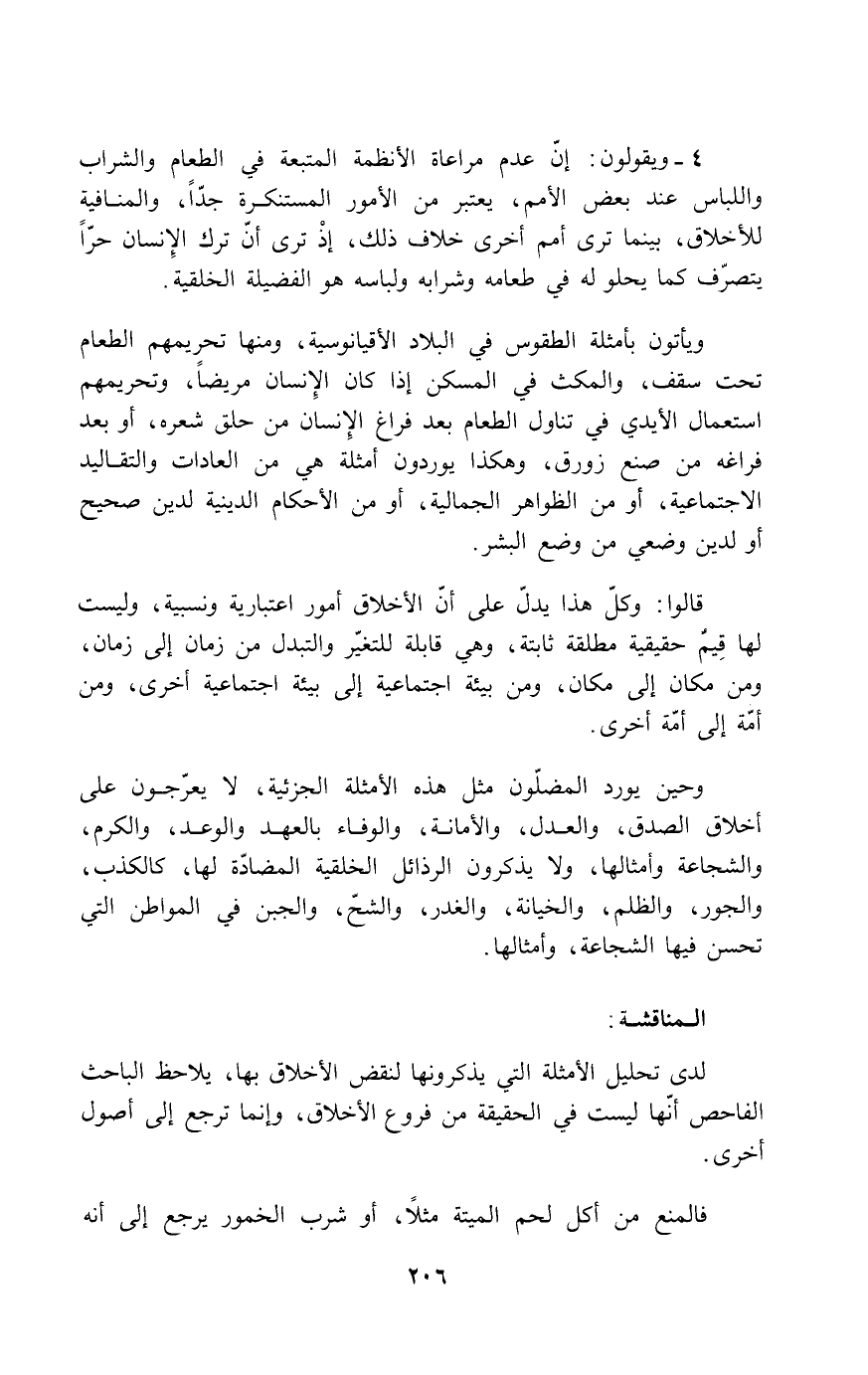 4- ويقولون: إن دعم مراعاة الأنظمة المتبعة في الطعام والشراب واللباس عند بعض الأمم، يعتبر من الأمور المستنكرة جداً، والمنافية للأخلاق، بينما ترى أمم أخرى خلاف ذلك، إذ ترى أن ترك الإنسان حراً يتصرف كما يحلو له في طعامه وشرابه ولباسه هو الفضيلة الخلقية.