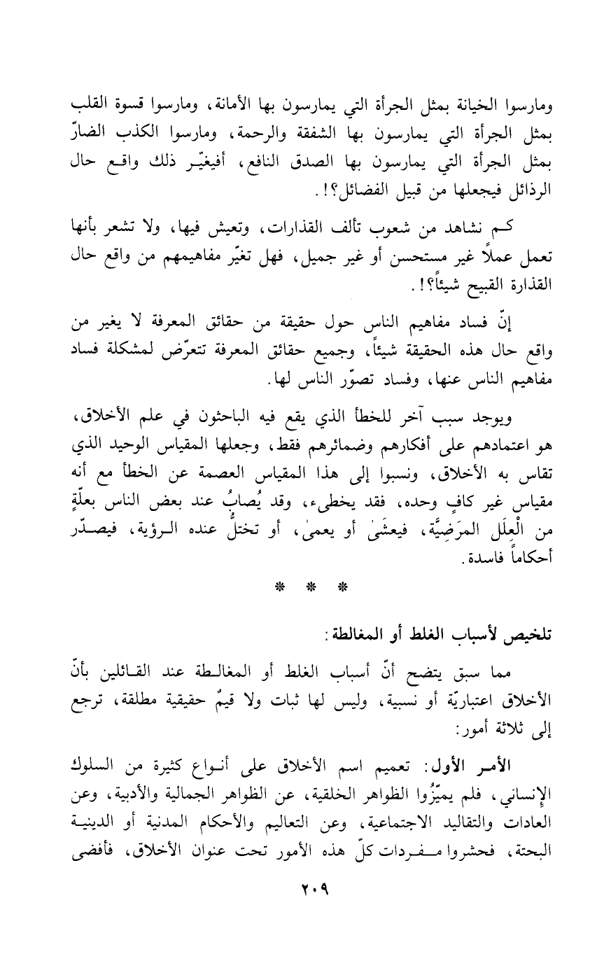 ومارسوا الخيانة بمثل الجرأة التي يمارسونها بها الأمانة، ومارسوا قسوة القلب بمثل الجرأة التي يمارسون بها الشفقة والرمة، ومارسوا الكذب الضار بمثل الجرأة التي يمارسون بها الصدق النافع، أفيغير ذلك واقع حال الرذائل فيجعلها من قبيل الفضائل؟!.