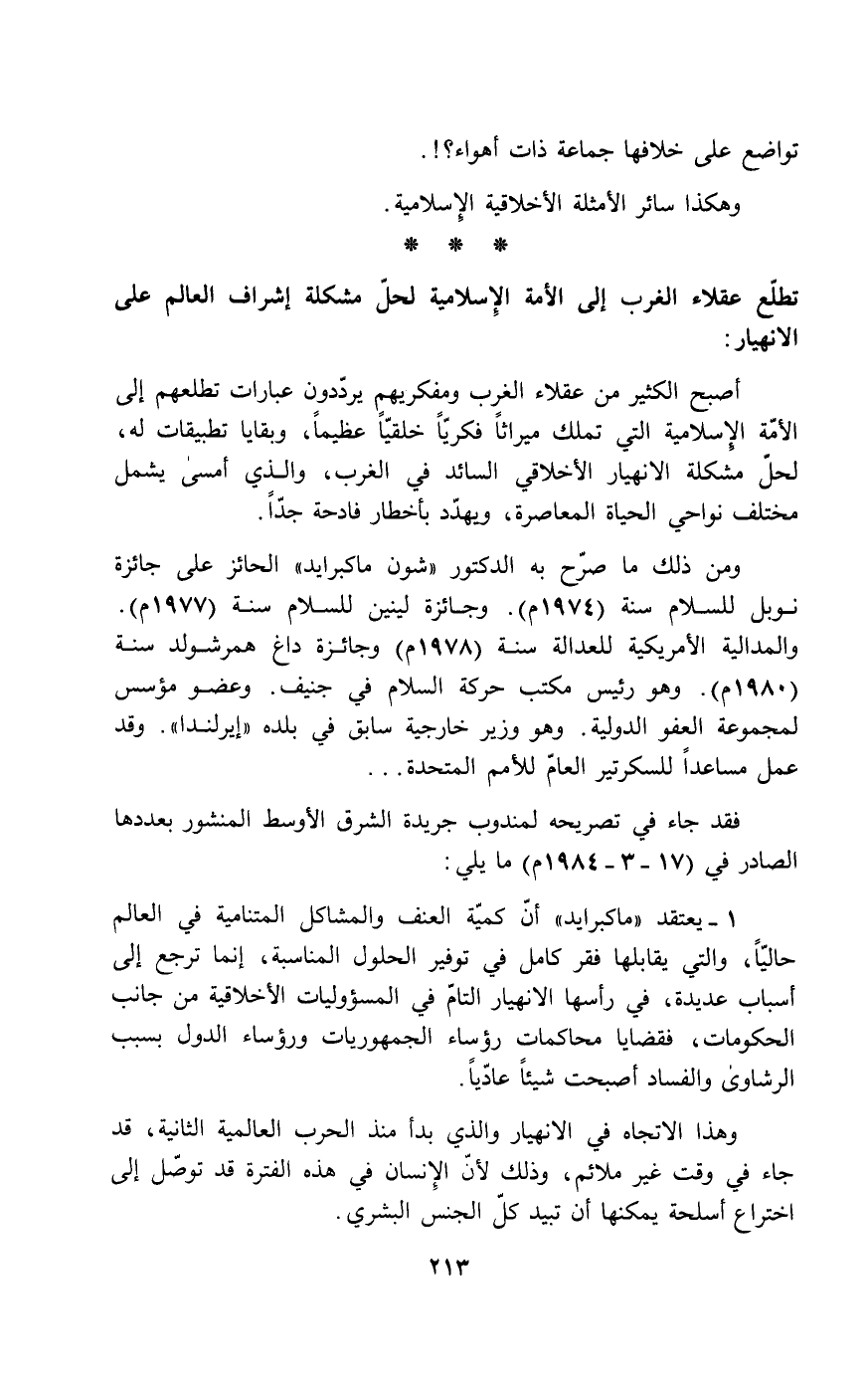 أصبح الكثير من عقلاء الغرب ومفكريهم يرددون عبارات تطلعهم إلى الأمة الإسلامية التي تملك ميراثاً فكرياً خلقياً عظيماً، وبقايا تطبيقات له، لحل مشكلة الانهيار الأخلاقي السائد في الغرب، والذي أمسى يشمل مختلف نواحي الحياة المعاصرة، ويهدد بأخطار فادحة جداً.