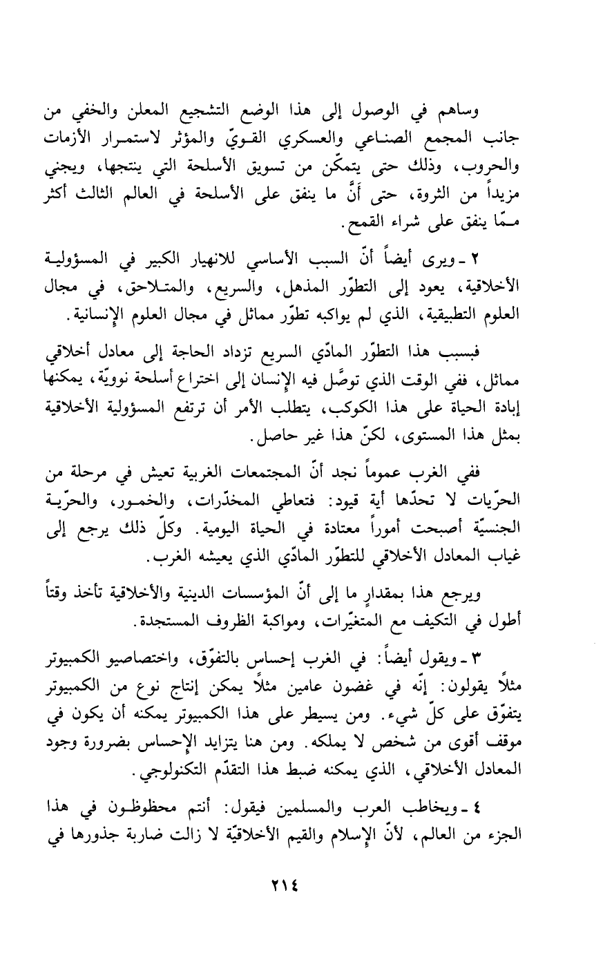 3- ويقول أيضاً: في الغرب إحساس بالتفوق، واختصاصيو الكمبيوتر مثلاً يقولون: إنه في غضون عامين مثلاً يمكن إنتاج نوع من الكمبيوتر يتفوق على كل شيء. ومن يسيطر على هذا الكمبيوتر يمكنه أن يكون في موقف أقوى من شخص لا يملكه. ومن هنا يتزايد الإحساس بضرورة وجود المعادل الأخلاقي، الذي يمكنه ضبط هذا التقدم التكنولوجي.