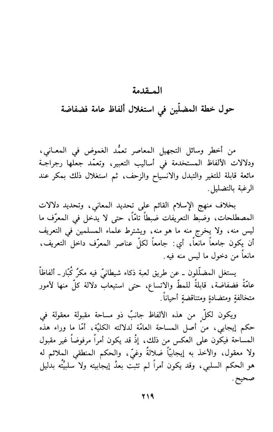 يستغل المضللون - عن طريق لعبة ذكاء شيطاني فيه مكرٌ كُبَّار - ألفاظاً عامةً فضفاضة، قابلة للمط والاتساع، حتى استيعاب دلالة كل منها لأمور متخالفةٍ ومتضادةٍ ومتناقضةٍ أحياناً.