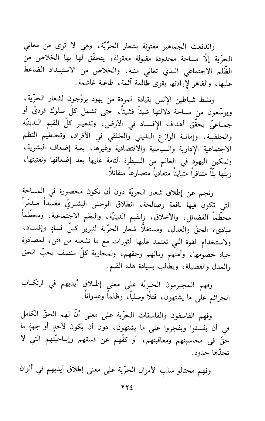 ونجم عن إطلاق شعار الحرية دون أن تكون محصورة في المساحة التي تكون فيها نافعة وصالحة، انطلاق الوحش البشري مفسداً مدمراً محطماً الفضائل، والأخلاق، والقيم الدينية، والنظم الاجتماعية، ومحطّماً مبادئ الحق والعدل، ومستغلاً شعار الحرية لتبرير كل فسادٍ وإفساد، ولاستخدام القوة التي تعتمد عليها الثورات مع ما تشعله من فتن، لمصادرة حياة خصومها، وأمنهم ومالهم وحقهم، ولمحاربة كل منصف يحب الحق والعدل والفضيلة، ويطالب بسيادة هذه القيم.