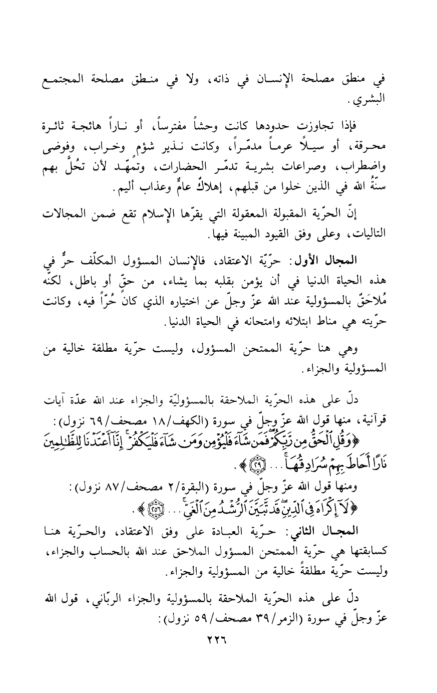 إن الحرية المقبولة المعقولة التي يقرها الإسلام تقع ضمن المجالات التاليات، وعلى وفق القيود المبينة فيها.