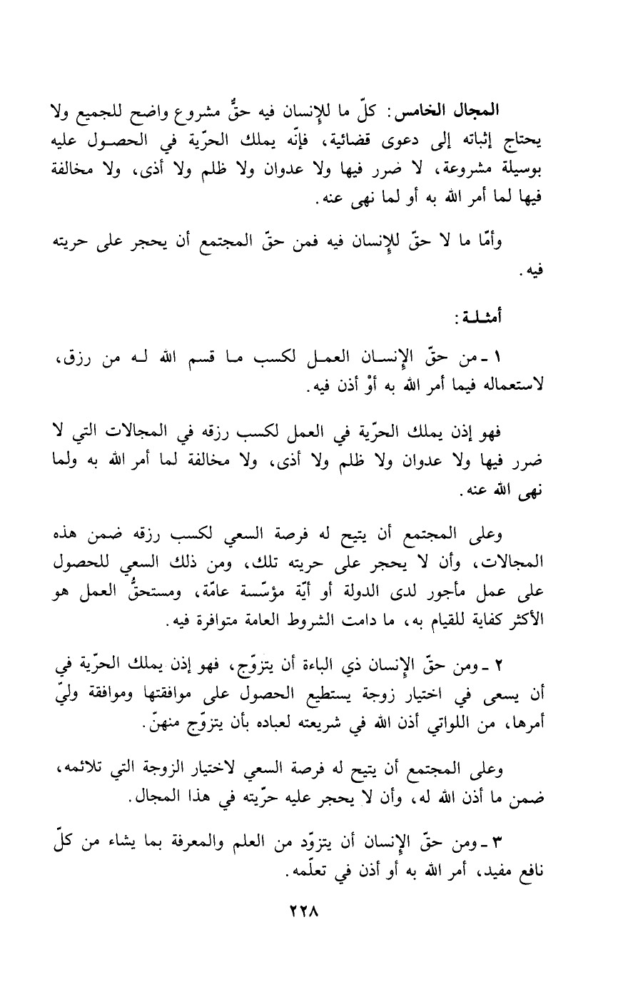 فهو إذن يملك الحرية في العمل لكسب رزقه في المجالات التي لا ضرر فيها ولا عدوان ولا ظلم ولا أذى، ولا مخالفة لما أمر الله به ولما نهى الله عنه.