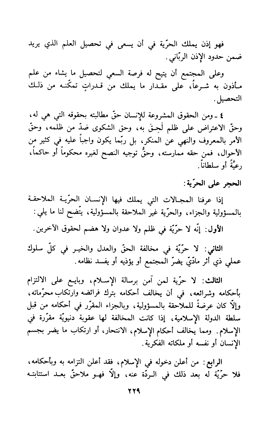 الثالث: لا حرية لمن آمن برسالة الإسلام، وبايع على الالتزام بأحكامه وشرائعه، في أن يخالف أحكامه بترك فرائضه وارتكاب محرماته، وإلا كان عرضةً للملاحقة بالمسؤولية، وبالجزاء المقرر في أحكامه من قبل سلطة الدولة الإسلامية، إذا كانت المخالفة لها عقوبة دنيوية مقررة في الإسلام. ومما يخالف أحكام الإسلام، الانتحار، أو ارتكاب ما يضر بجسم الإنسان أو نفسه أو ملكاته الفكرية.