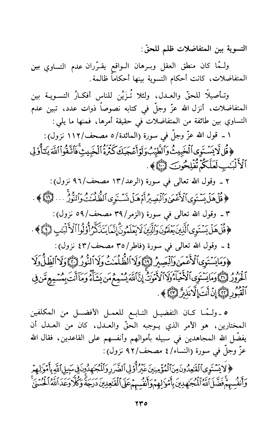 5- ولمّا كان التفضيل التابع للعمل الأفضل من المكلفين المختارين، هو الأمر الذي يوجبه الحق والعدل، كان من العدل أن يفضل الله المجاهدين في سبيله بأموالهم وأنفسهم على القاعدين، فقال الله عزّ وجلّ في سورة (النساء/4 مصحف/92 نزول) :