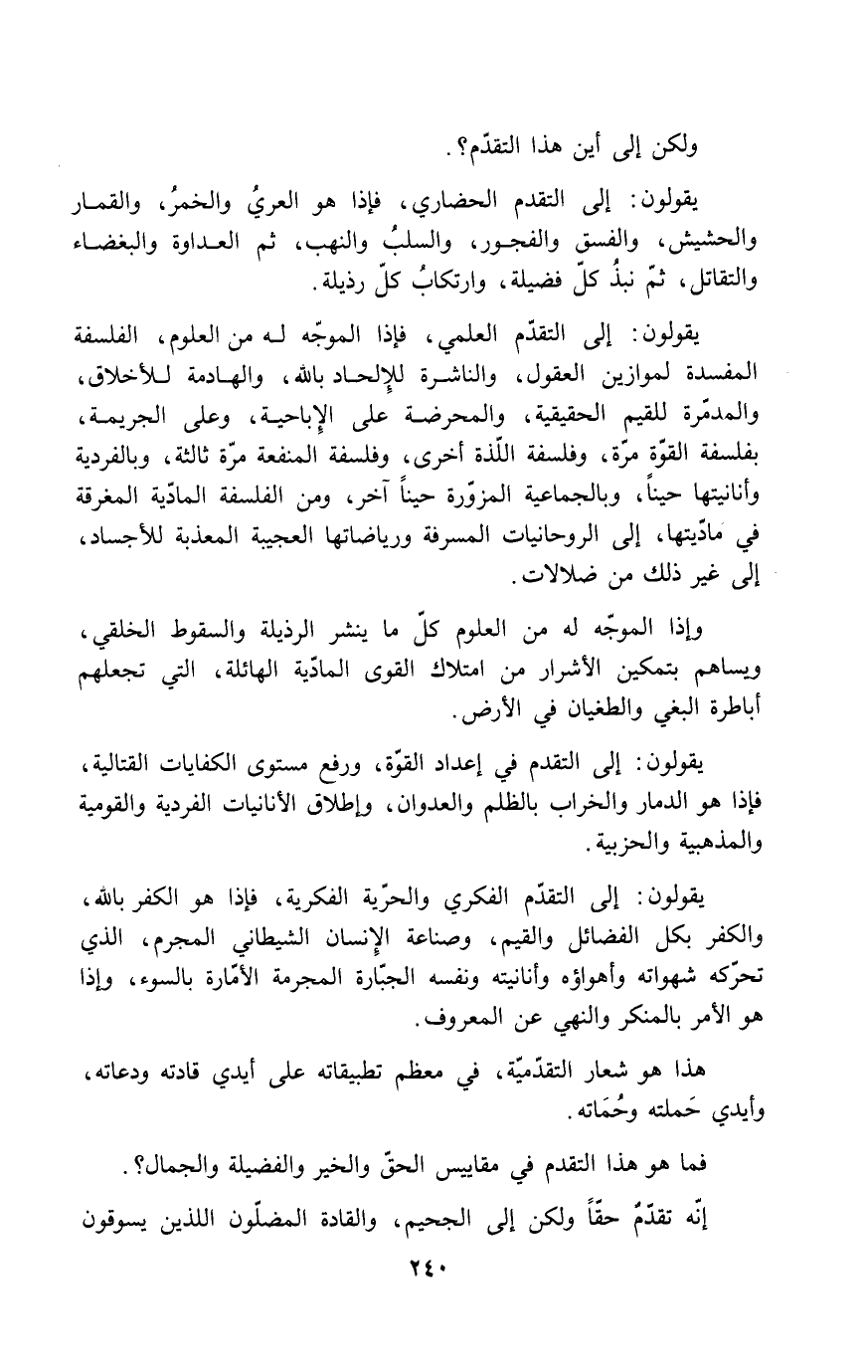 يقولون: إلى التقدم العلمي، فإذا الموجه له من العلوم، الفلسفة المفسدة لموازين العقول، والناشرة للإلحاد بالله، والهادمة للأخلاق، والمدمّرة للقيم الحقيقية، والمحرضة على الإباحية، وعلى الجريمة، بفلسفة القوة مرة، وفلسفة اللذة أخرى، وفلسفة المنفعة مرة ثالثة، وبالفردية وأنانيتها حيناً، وبالجماعية المزورة حيناً آخر، ومن الفلسفة المادية المغرقة في ماديتها، إلى الروحانيات المسرفة ورياضاتها العجيبة المعذبة للأجساد، إلى غير ذلك من ضلالات.