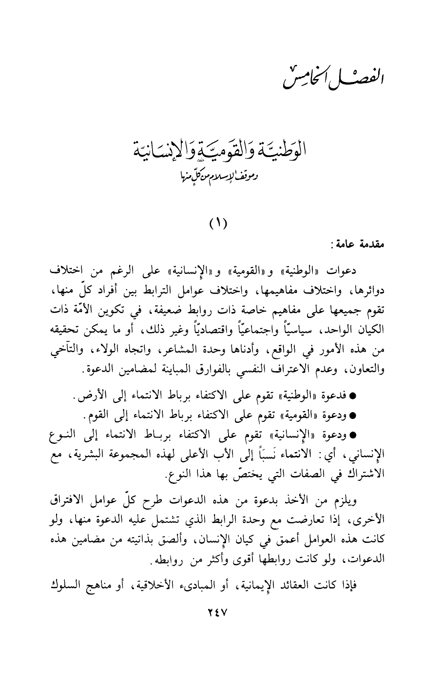 * ودعوة "القومية" تقوم على الاكتفاء برباط الانتماء إلى القوم.