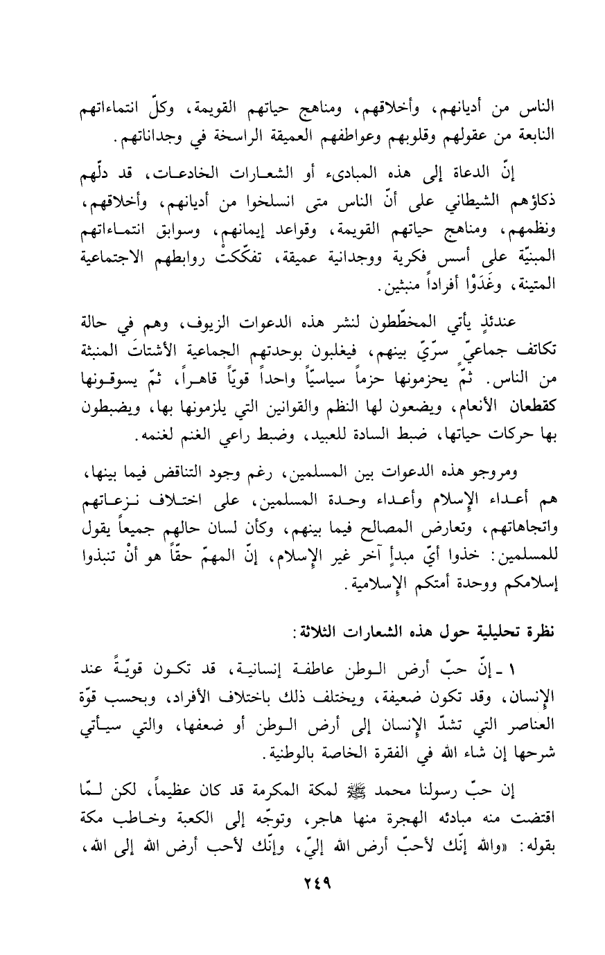 إن الدعاة إلى هذه المبادئ أو الشعارات الخادعات، قد دلهم ذكاؤهم الشيطاني على أن الناس متى انسلخوا من أديانهم، وأخلاقهم، ونظمهم، ومناهج حياتهم القومية، وقواعد إيمانهم، وسوابق انتمائهم المبنيّة على أسس فكرية ووجدانية تفككت روابطهم الاجتماعية المتينة، وغدوا أفارداً منبثين.